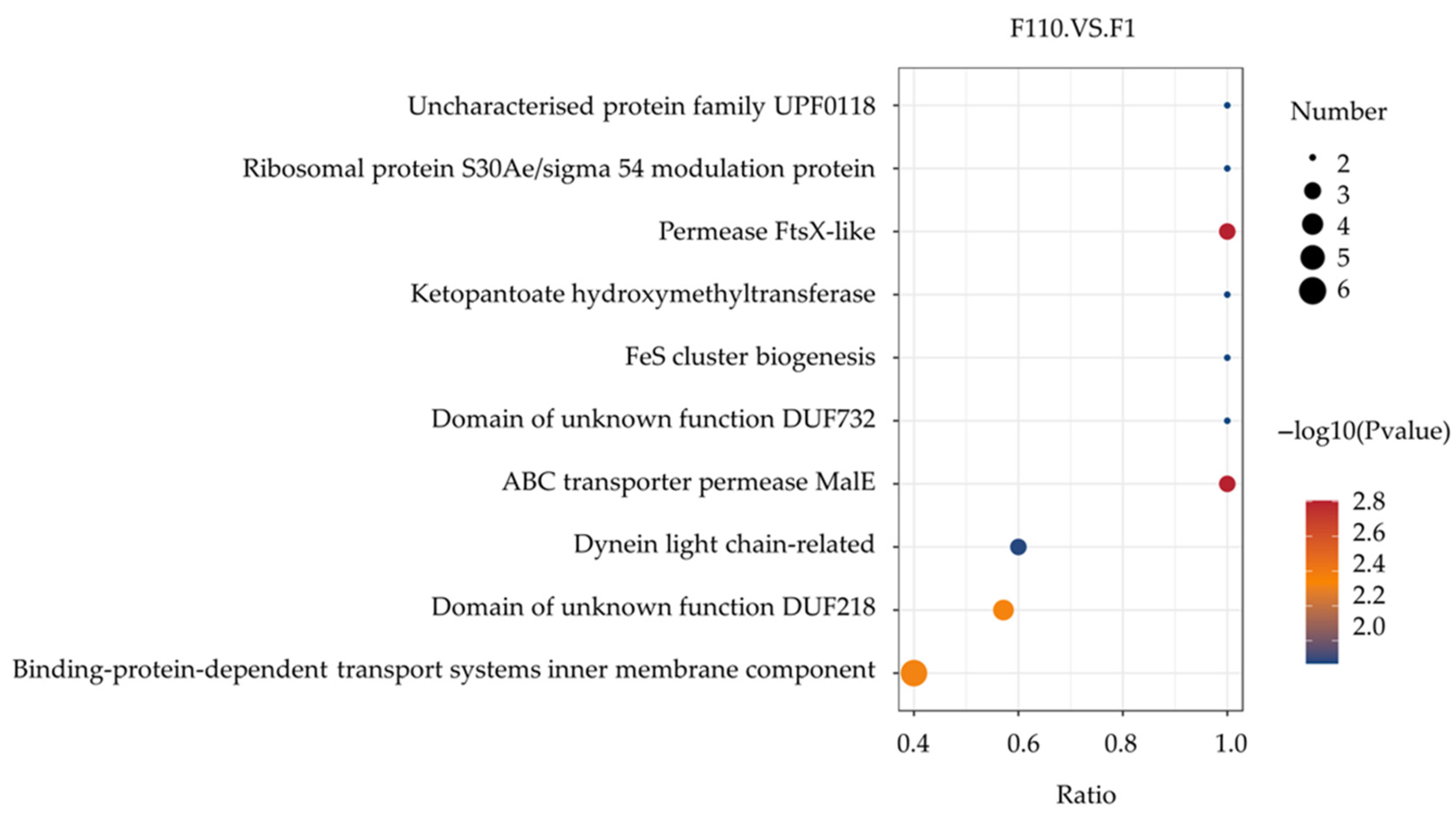 | Protein Accession Number | Protein Description | Gene Name | Expression Change (F110 vs. F1 log2FC) | F110 vs. F1 p Value | Functional Category |