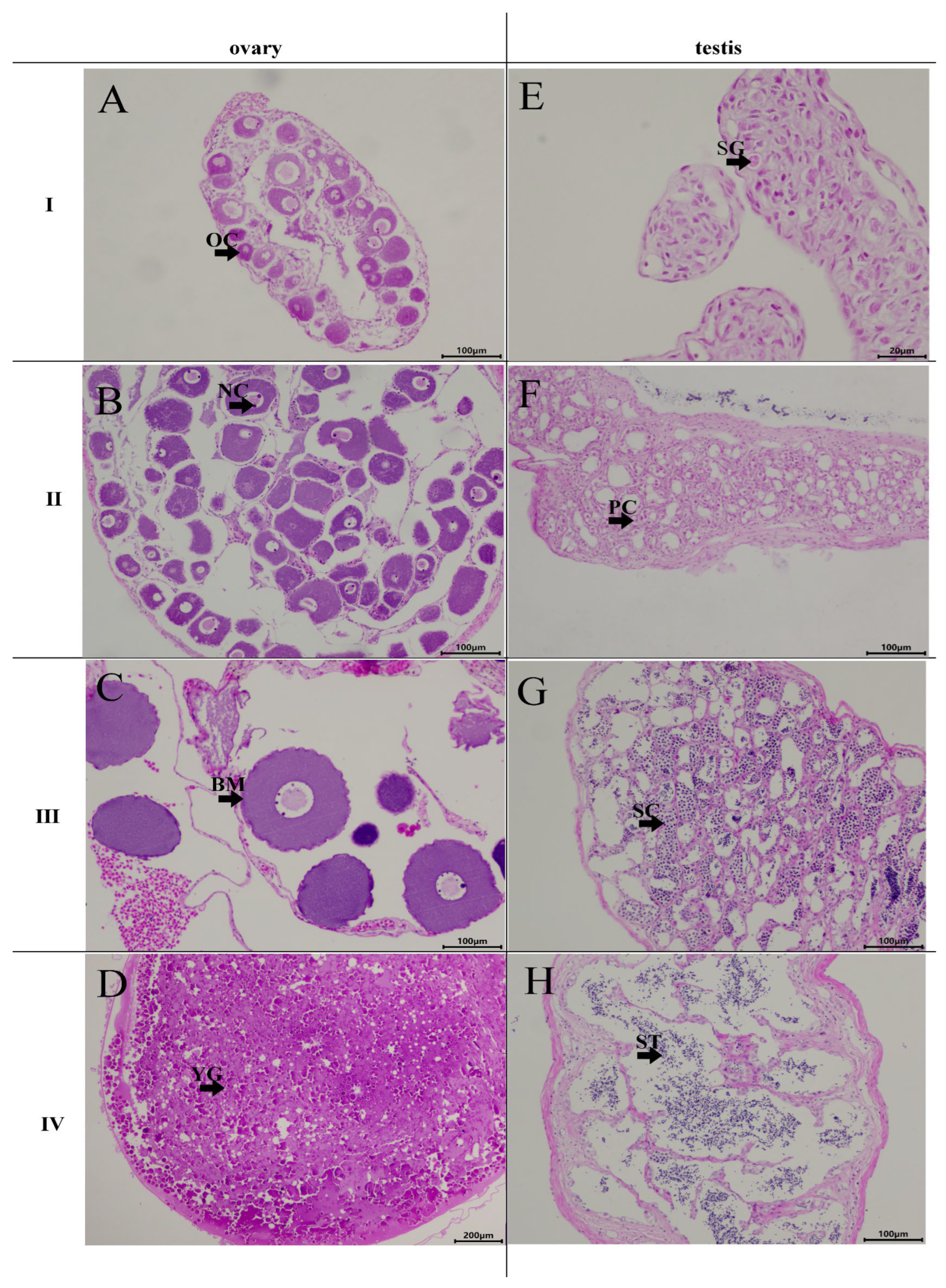 - Xu, H.; Lin, W.; Ma, X.; Jawad, M.; Wu, M.; Qiu, J.; Li, M. A timecourse analysis of gonadal histology and transcriptome during the sexual development of yellow catfish, Pelteobagrus fulvidraco. Comp. Biochem. Phys. D 2025, 56, 101576. [Google Scholar] [CrossRef]