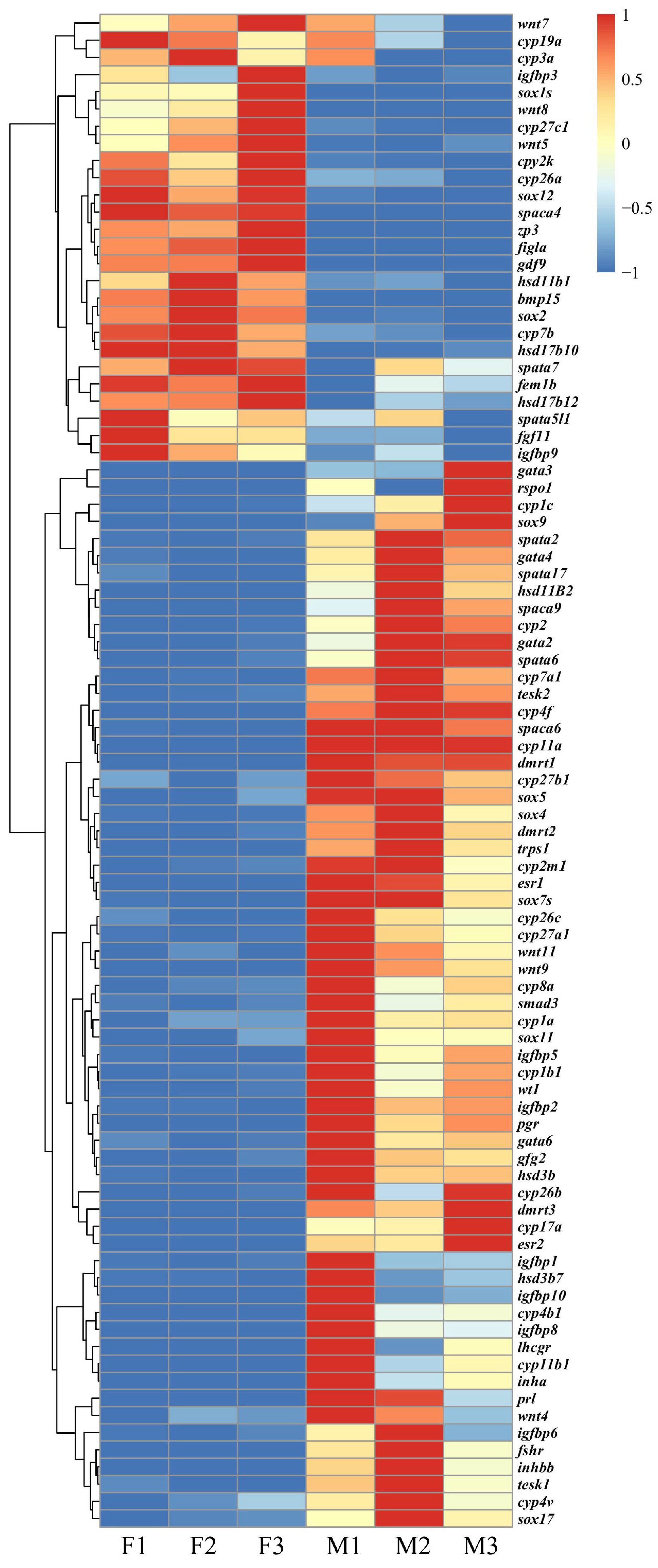 - Wu, D.; Chen, S.Q.; Ke, L.; Zang, Z.; Zhu, J.; Pan, L.; Li, F.; Xu, R.; Peng, L.; Bian, L.; et al. Comparative analysis of the male and female gonadal transcriptome of Thamnaconus septentrionali. Prog. Fish. Sci. 2024, 45, 53–64. [Google Scholar] [CrossRef]