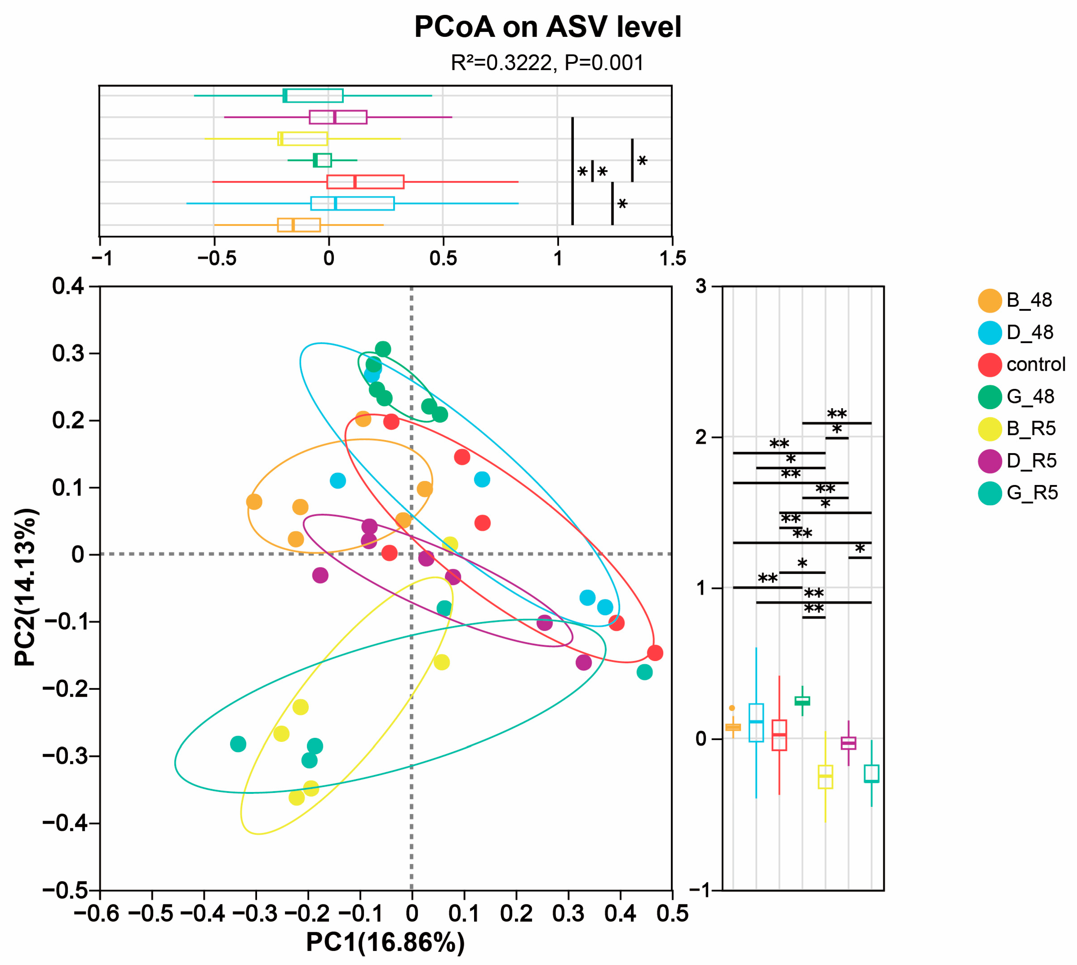 4.2. Effect of MPs and Cd on Species Differences in Pearl Oyster Gut Microbiota