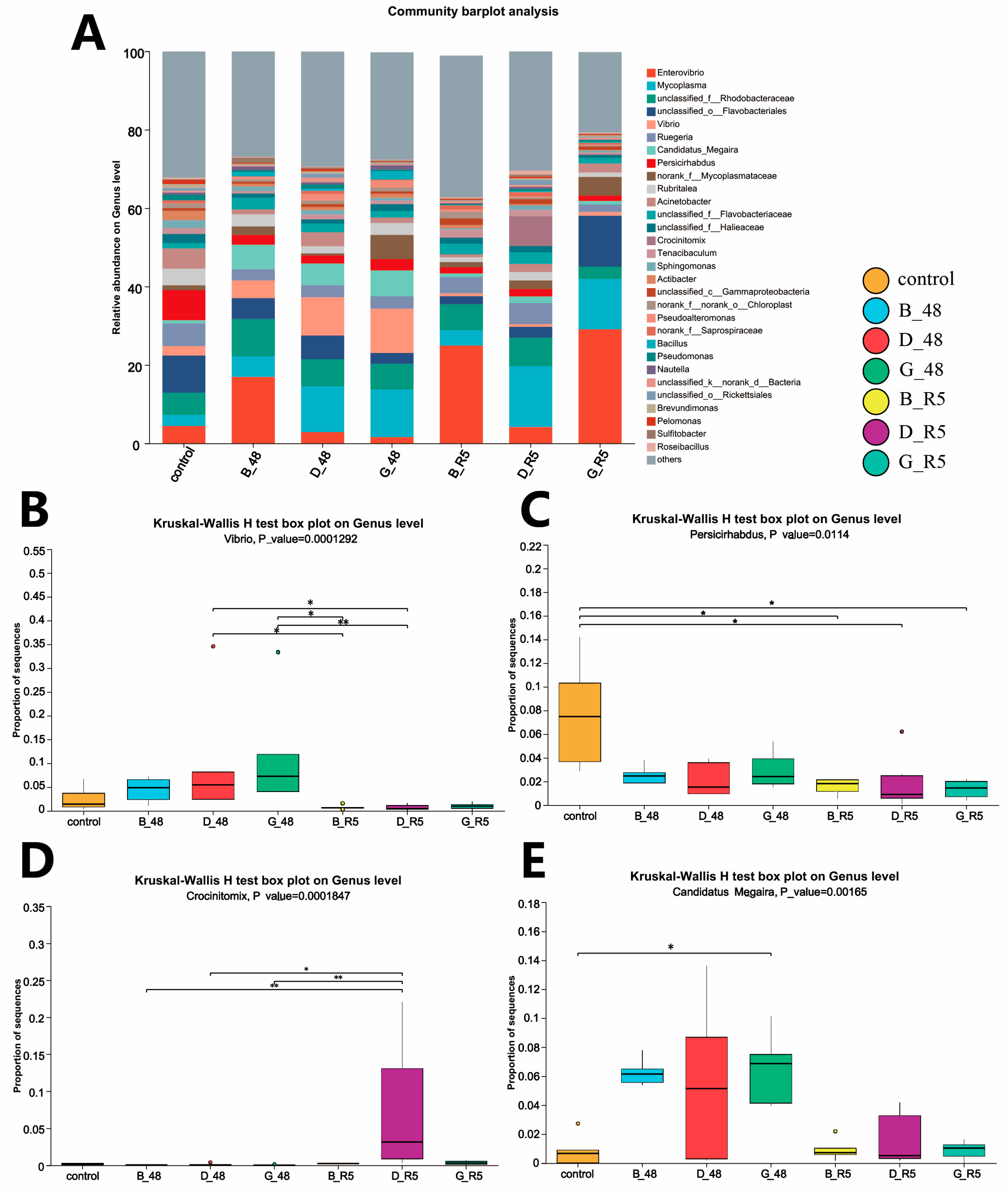- Alfiansah, Y.R.; Peters, S.; Harder, J.; Hassenrück, C.; Gärdes, A. Structure and co-occurrence patterns of bacterial communities associated with white faeces disease outbreaks in Pacific white-leg shrimp Penaeus vannamei aquaculture. Sci. Rep. 2020, 10, 11980. [Google Scholar] [CrossRef]
