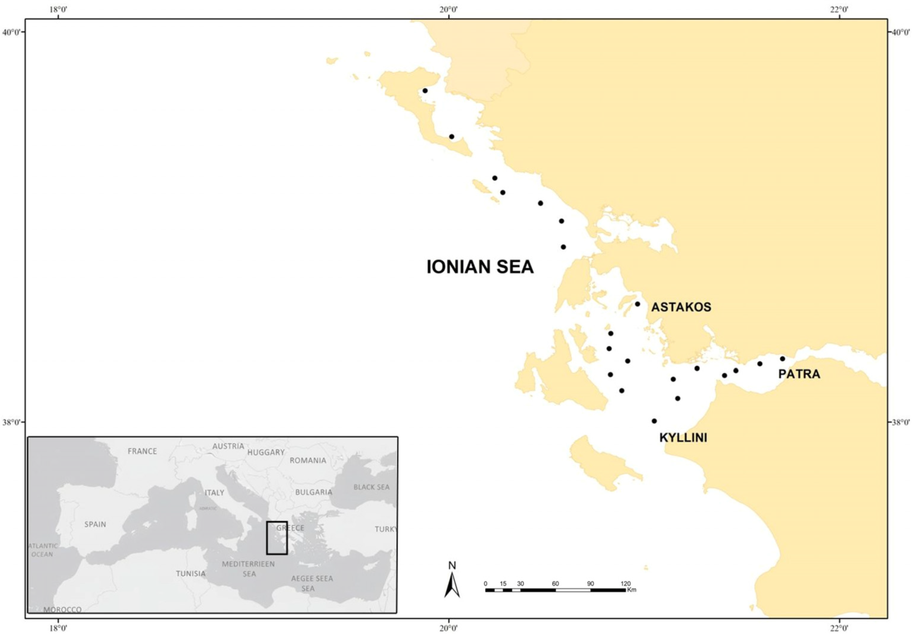 - El Achi, N.; Tsikliras, A.C.; Moutopoulos, D.K. Small pelagic fisheries and gear selectivity in the Eastern Ionian Sea. Mediterr. Mar. Sci. 2021, 22, 451–463. [Google Scholar]