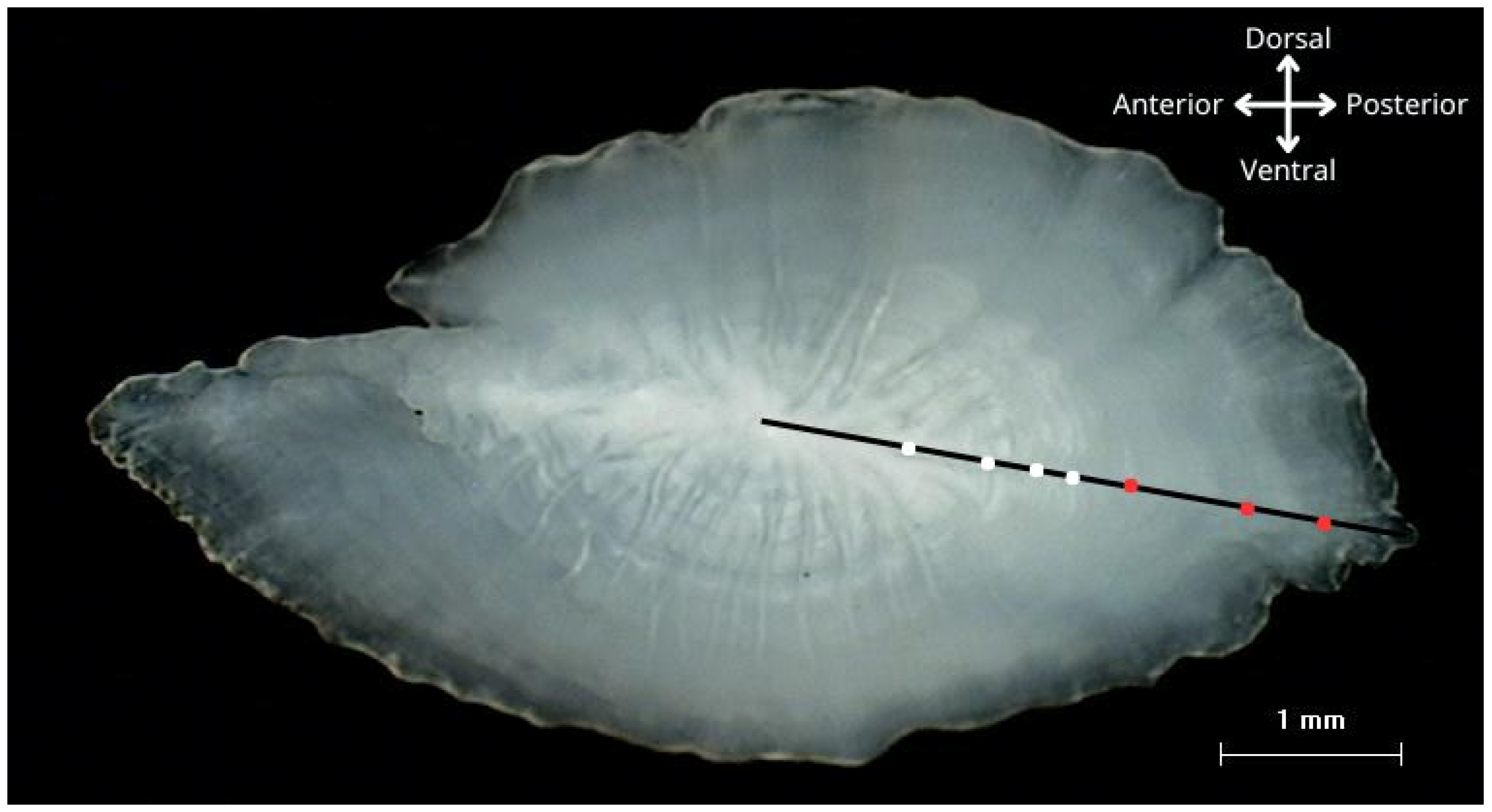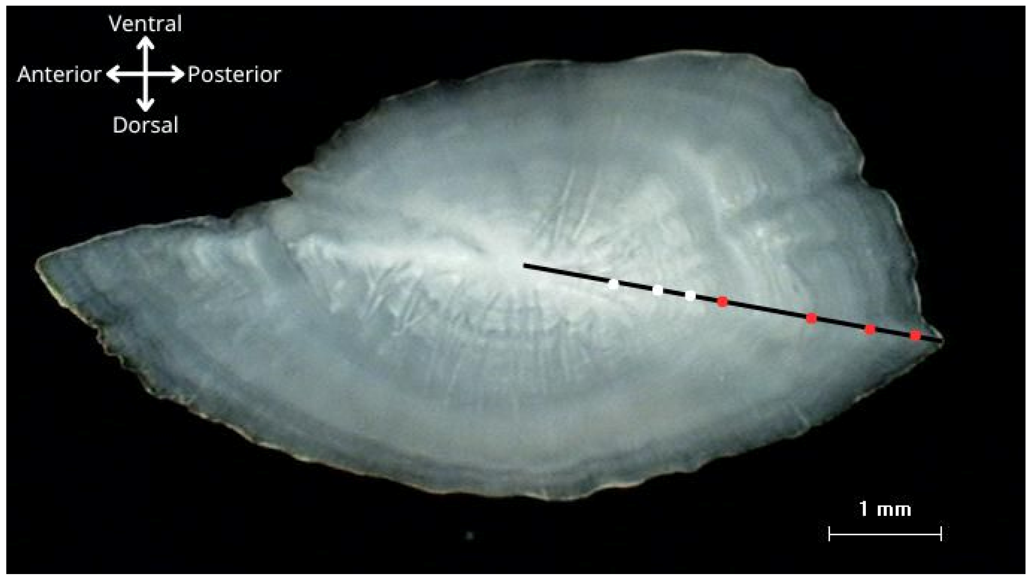 - Campana, S.E. Otolith science entering the 21st century. Mar. Freshw. Res. 2004, 55, 637–654. [Google Scholar] [CrossRef]