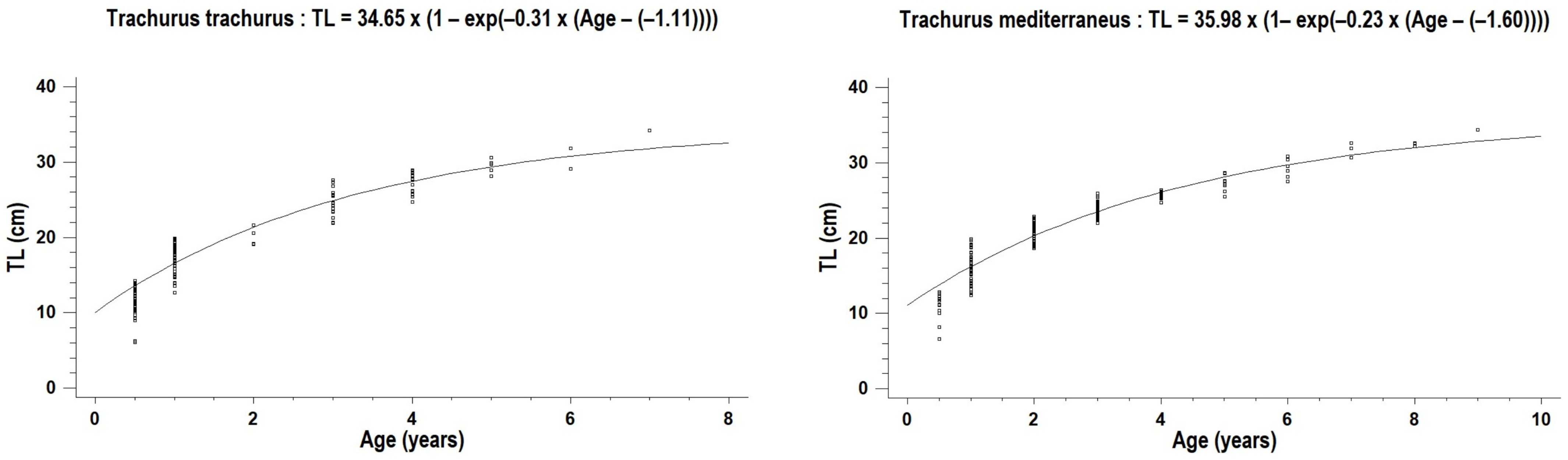 - Basilone, G.; Ferreri, R.; Aronica, S.; Bonanno, A.; Genovese, S.; Rumolo, P.; Carbonara, P.; Barra, M. Growth variability in Atlantic horse mackerel Trachurus trachurus (Linnaeus, 1758) across the central Mediterranean Sea: Contrasting latitudinal gradient and different ecosystems. Front. Mar. Sci. 2023, 10, 1161552. [Google Scholar] [CrossRef]