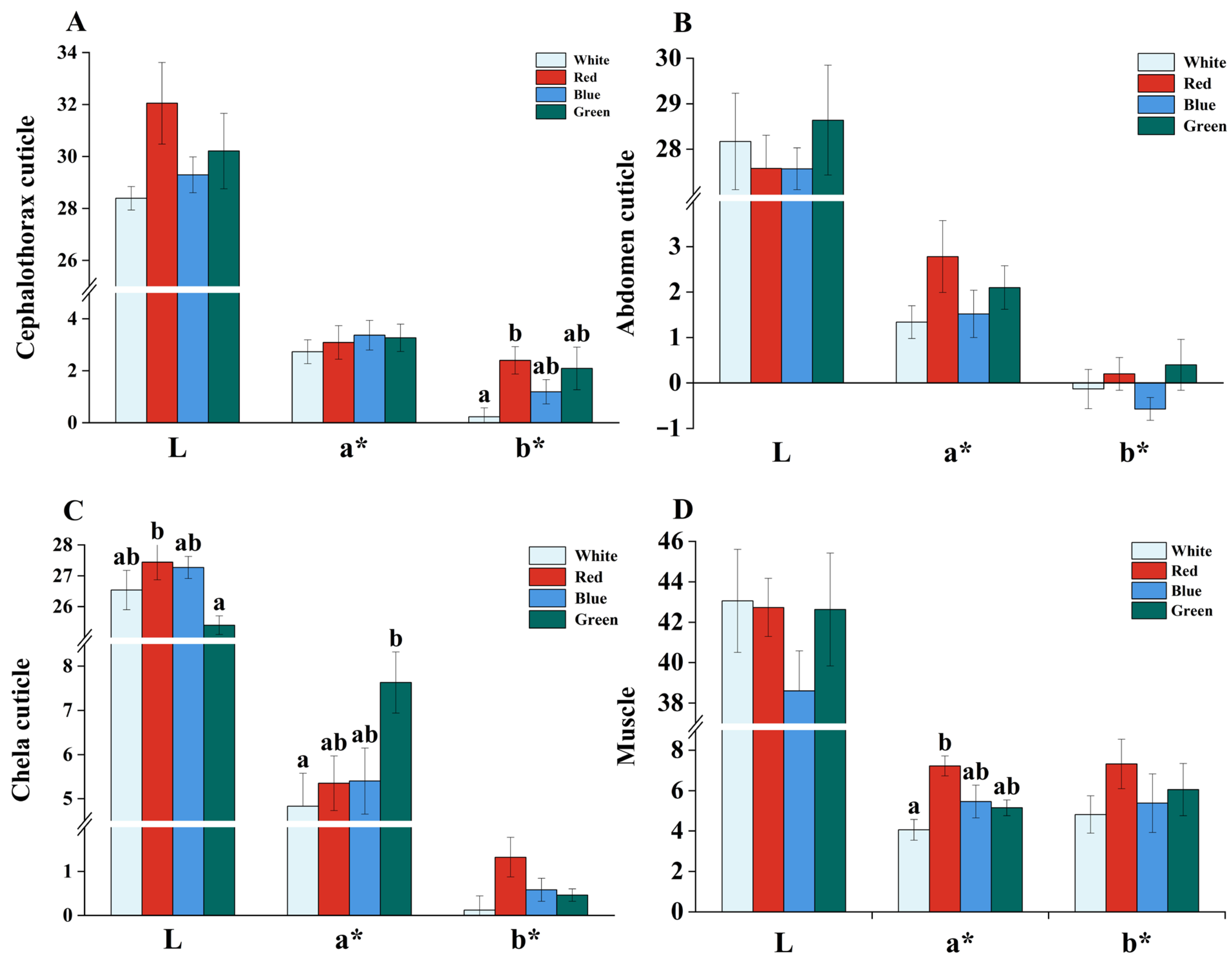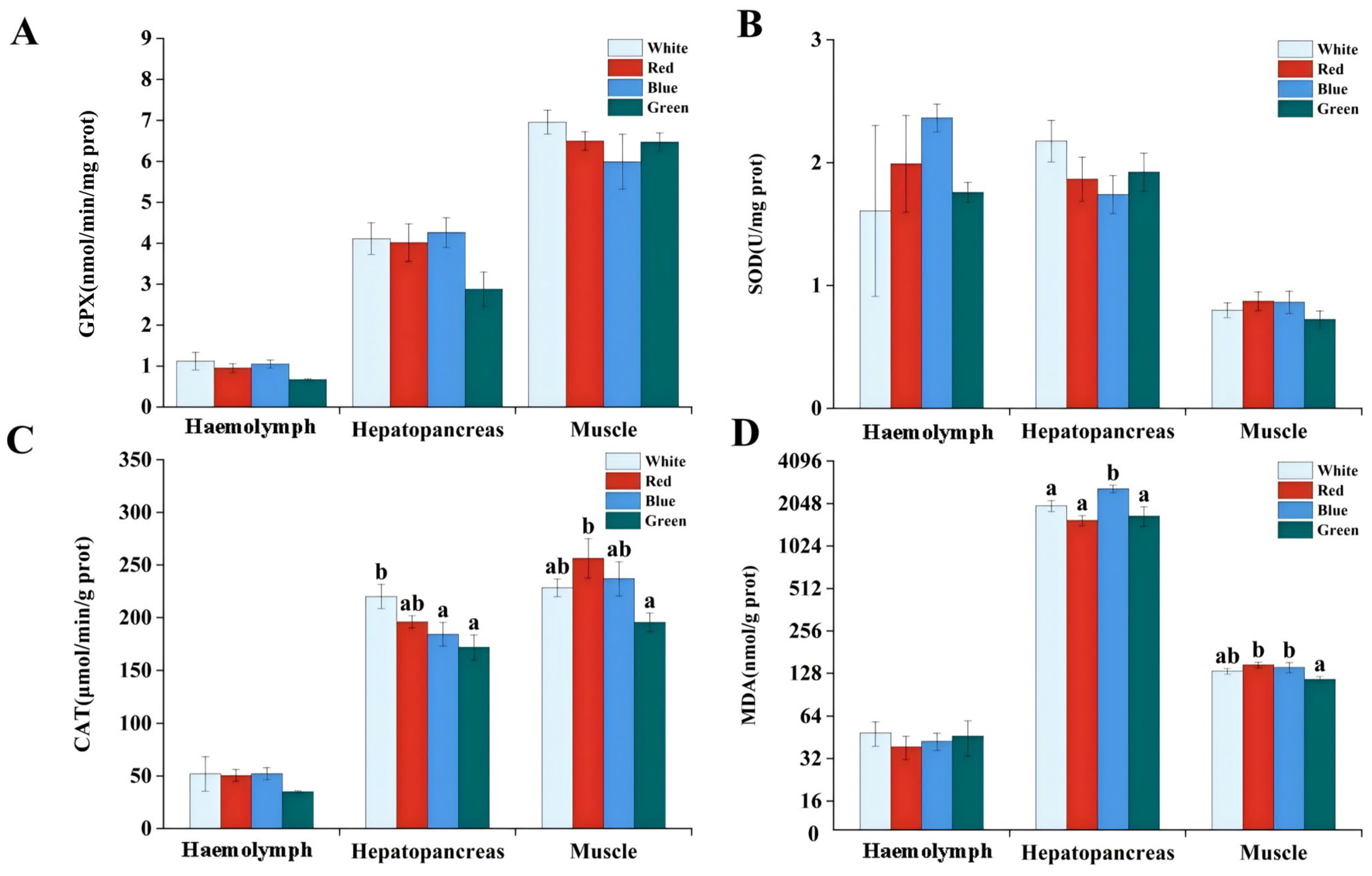 - Chen, S.; Shi, C.; Migaud, H.; Song, C.; Mu, C.; Ye, Y.; Wang, C.; Ren, Z. Light spectrum impacts on growth, molting, and oxidative stress response of the mud crab Scylla paramamosain. Front. Mar. Sci. 2022, 9, 840353. [Google Scholar] [CrossRef]
