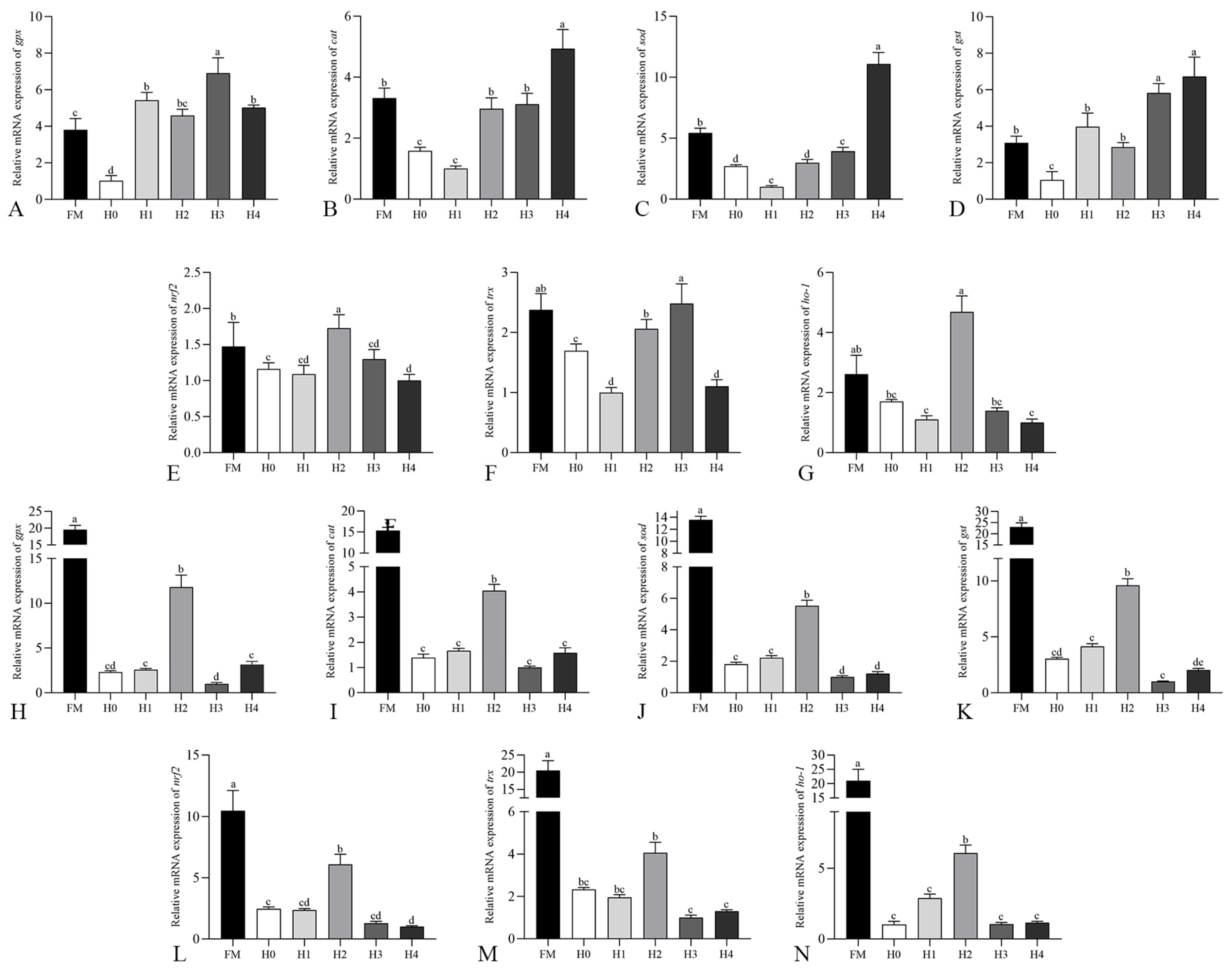 Antioxidant-related enzymes and indices play significant roles in responding to organismal stress and resisting oxidative damage, such as GPX, CAT, T-AOC, and GR [