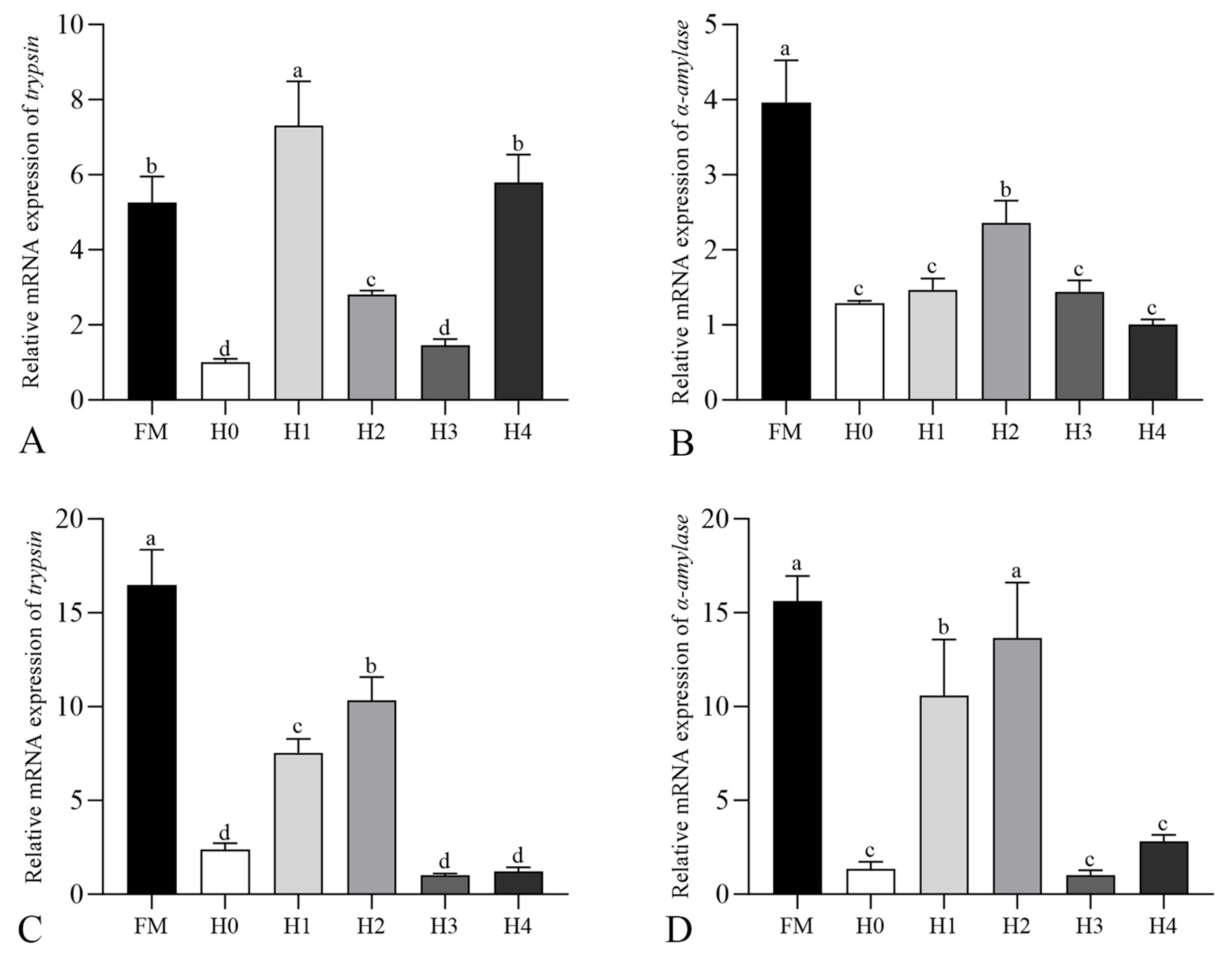 α-amylase genes exhibited a significant upward trend in the hepatopancreas and intestine of the RKR-supplemented groups, which is consistent with the trend of enzyme indices. It has been reported that red yeast rice distiller’s grains can effectively improve nutrient digestibility in goats, with the 10% treatment group achieving the best results [