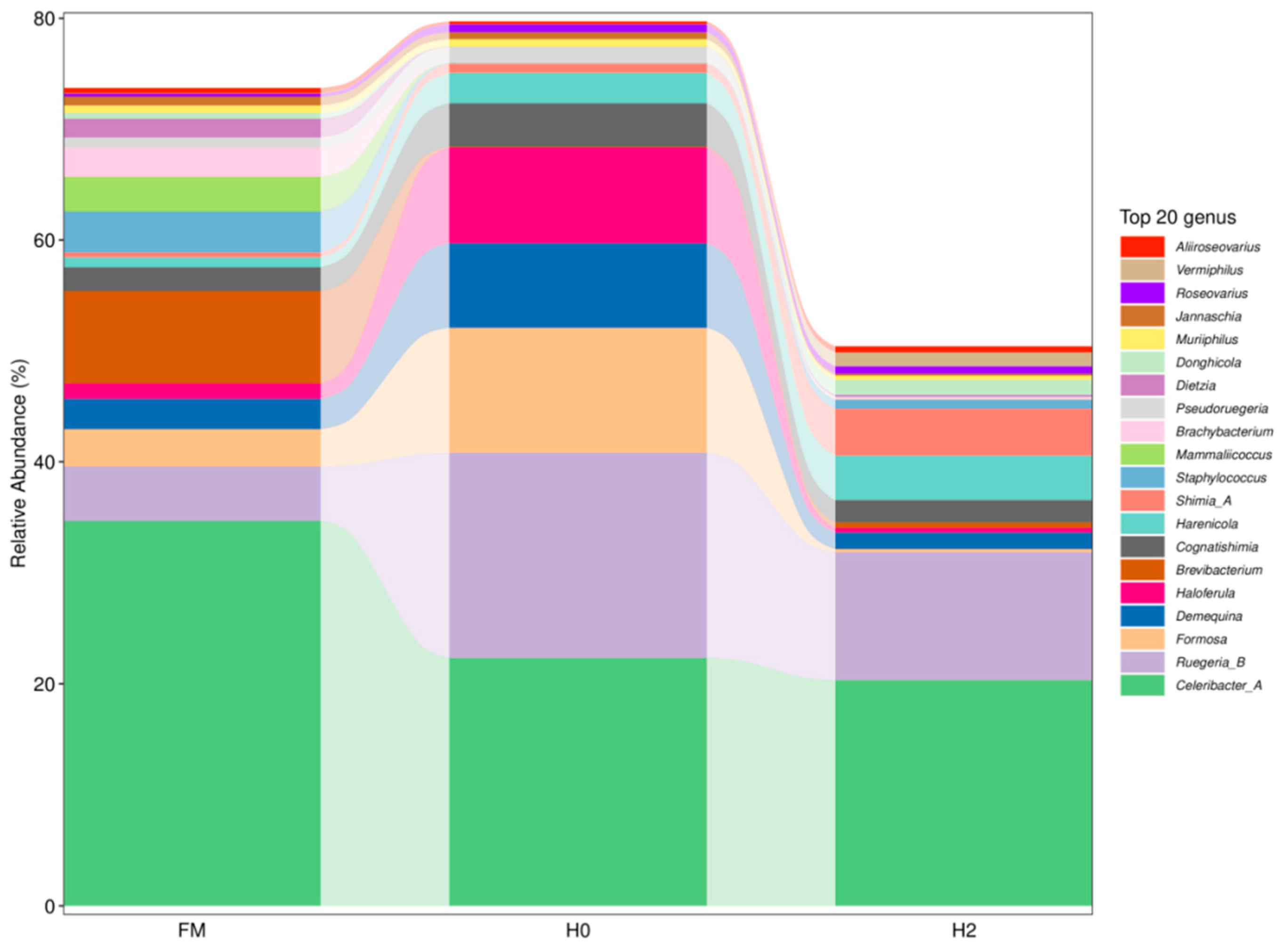 Pseudoruegeria in the H0 group was higher than that in the H2 group (