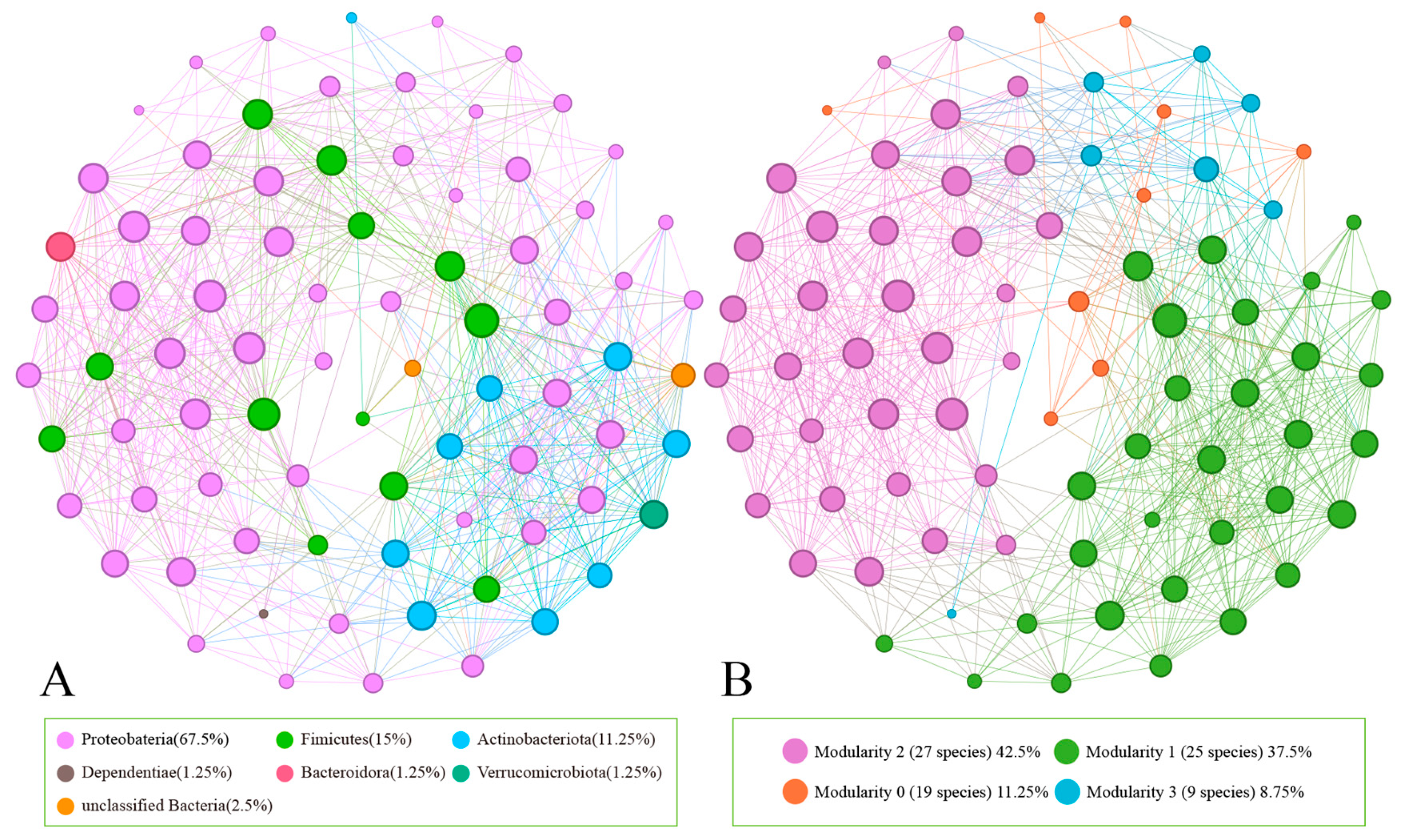 48]. By constructing random networks, which can compare with the real network, we could identify the impact of each type of microorganism on the microbial community network. Modularity can reflect the niche differentiation of microbial communities, be used to evaluate microbial synergy and stability, and to a certain extent, indicate the host’s adaptability to the environment and health status [