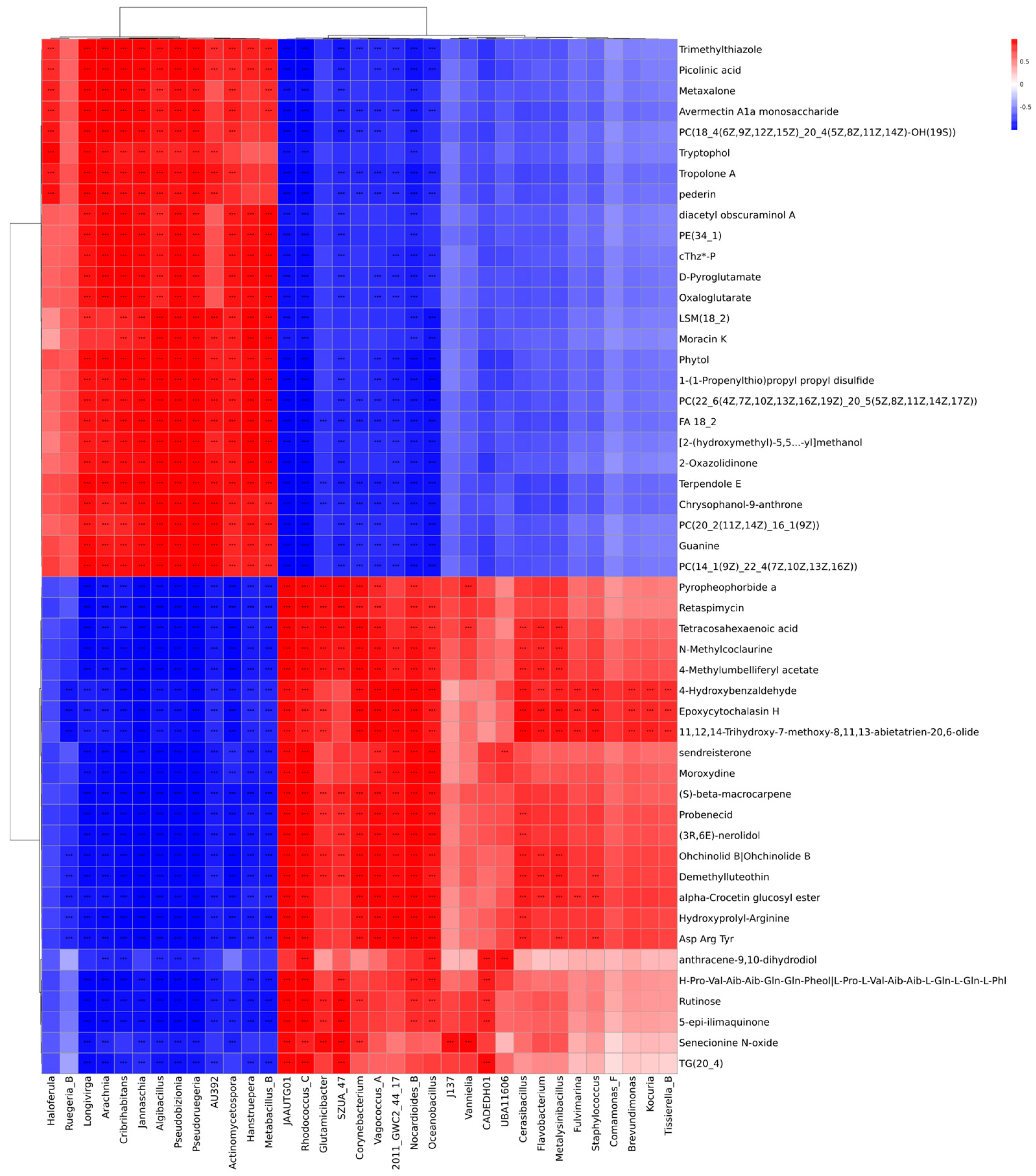 Rhodococcus_C were significantly correlated with 50 types of metabolites. Studies have indicated that