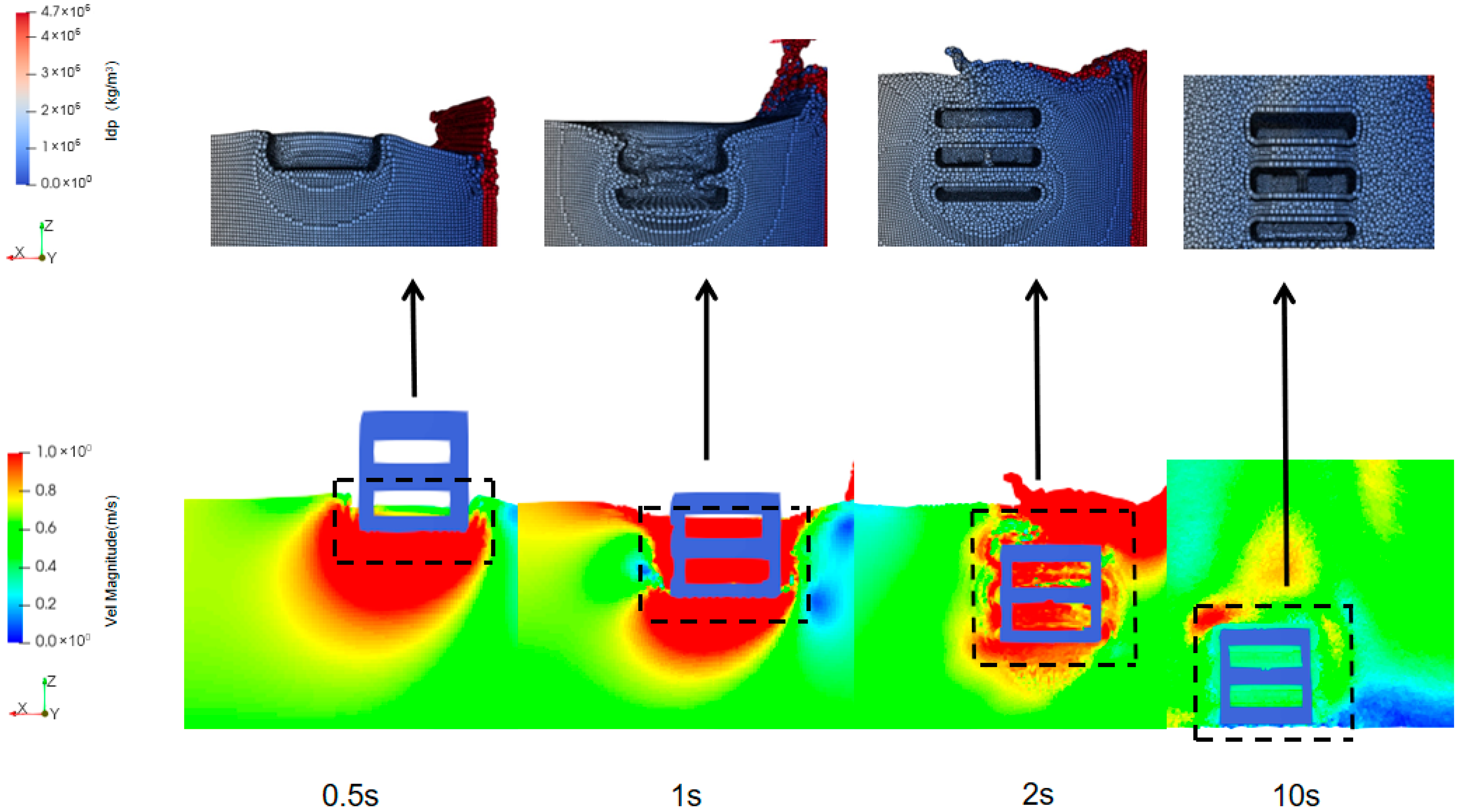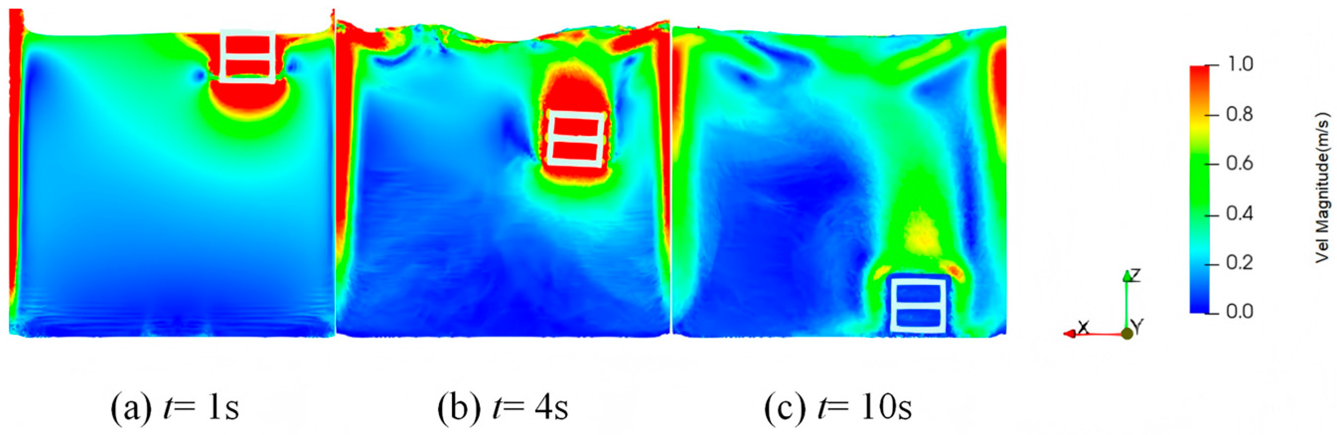- Flow field variations during artificial reef deployment: The deployment of the cubic artificial reef induces significant disturbance effects on the surrounding flow field. Particularly during the initial deployment stage, the impact force generated as the reef enters the water causes intense water disturbance, leading to the formation of distinct vortex and recirculation zones. Furthermore, during the sinking process, flow field stratification phenomena are observed.