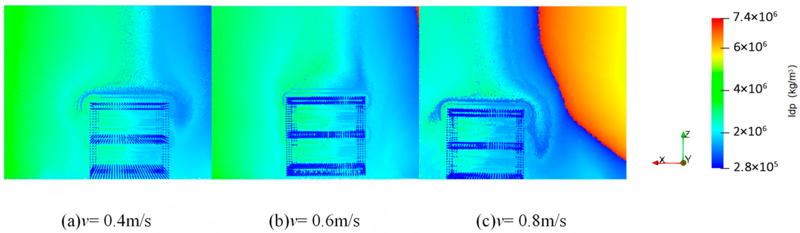 - Influence of inflow velocity on artificial reef deployment performance: At inflow velocities of 0.4 m/s, the pressure distribution is relatively uniform, with minor pressure fluctuations generated during reef water entry and a gradual pressure gradient. As the inflow velocity increases (0.6 m/sand 0.8 m/s), the pressure fluctuations induced during water entry progressively intensify, forming distinct high- and low-pressure zones. Under lower flow velocity conditions (e.g., 0.4 m/s), localized regions of high particle concentration are observed. In contrast, with increasing inflow velocity (e.g., 0.6 m/s and 0.8 m/s), the particle concentration relatively decreases.