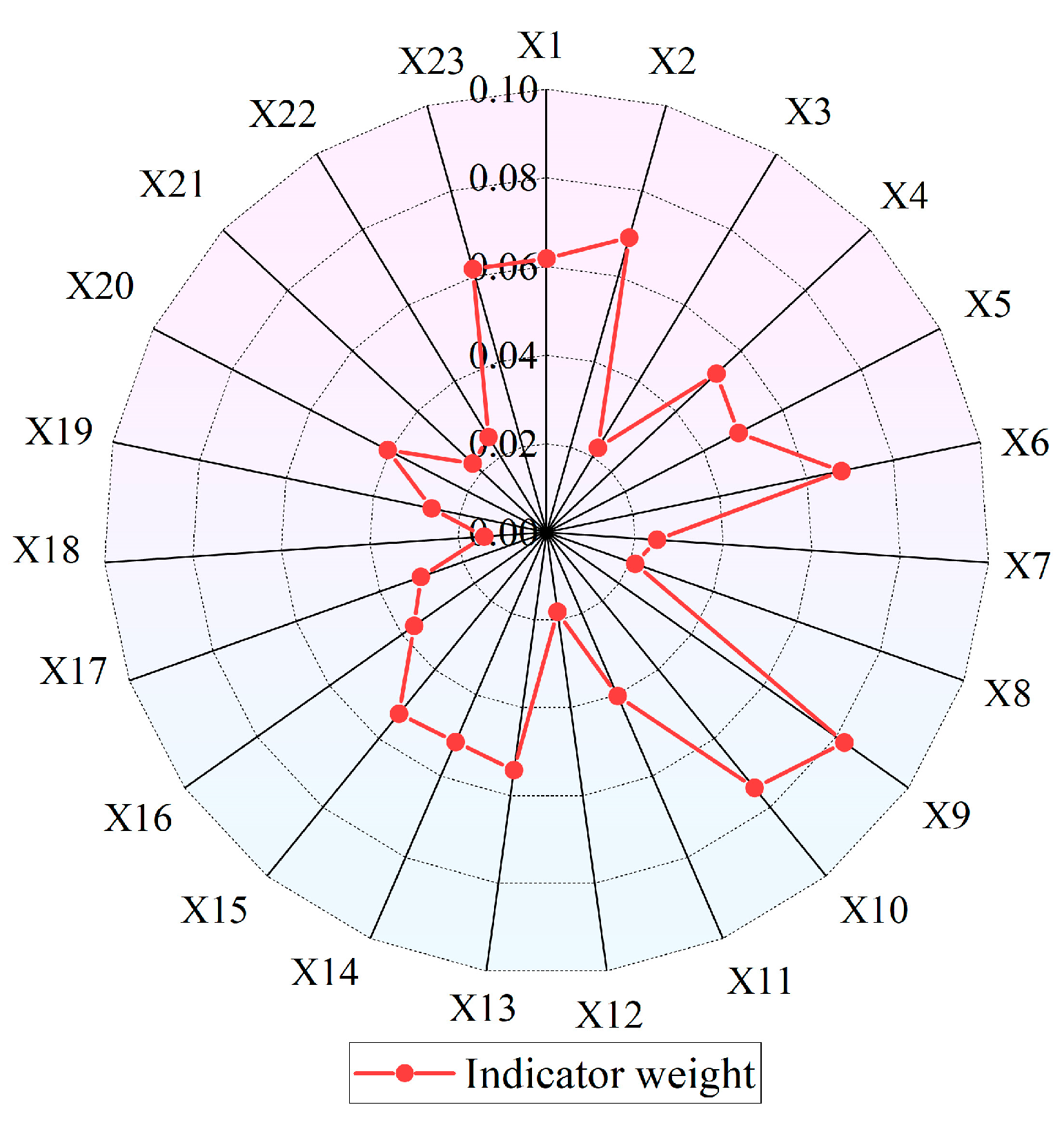 Indicator weights were calculated using the entropy weight method, and the results are presented in Figure 1. The results indicate substantial heterogeneity in the contribution of different indicators to the overall system information. Among them, Patents obtained (X9) and Theses published (X10) exhibit relatively high weights, at 0.0823 and 0.0744, respectively, indicating that technological innovation and knowledge output show substantial variability and information content during the study period and constitute key driving forces for the development of the fishery. In addition, the weights of the Growth rate of total output value of marine aquaculture (X1), Growth rate of total output value of marine fishing (X2), Growth rate of per capita net income of fishermen (X6), and Number of marine ranching sites (X23) are also relatively high, indicating that industrial growth vitality, improvements in fishermen’s income, and the development of marine ranching exert significant influences on the sustainable development of fisheries. By contrast, indicators such as the Number of aquaculture technology promotion institutions (X12), Fishery law enforcement agencies (X18), and several population- and disaster-related indicators (e.g., Population growth rate of fishery employees (X7), Growth rate of the fishing population (X8), and Loss of aquatic products (X21)) display relatively low weights, reflecting limited variability during the sample period and a weaker discriminative capacity in the composite evaluation. Overall, indicators related to economic development and technological innovation occupy a dominant position within the evaluation system, whereas management- and safeguard-related indicators primarily function as foundational support components.