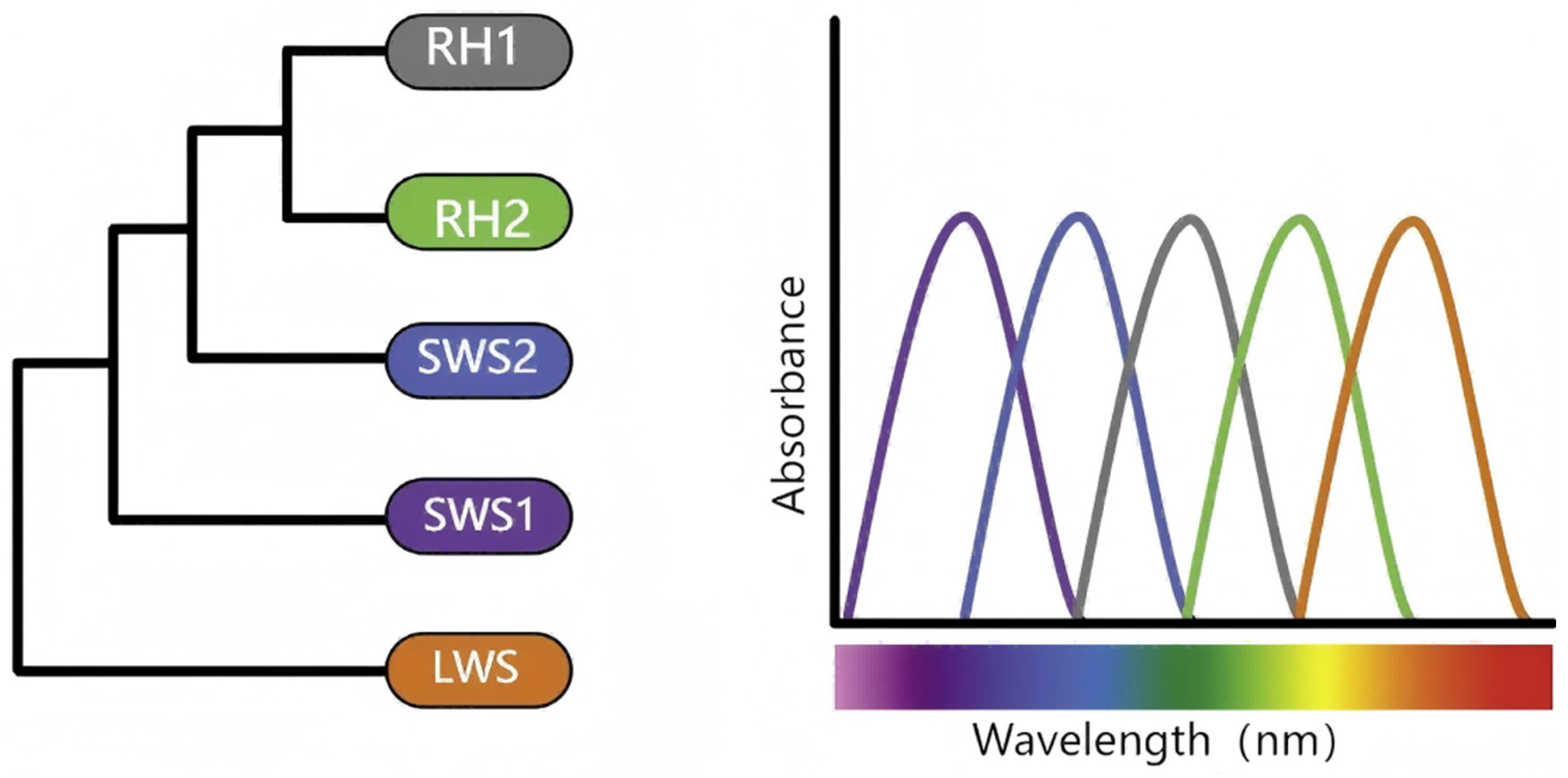- Hauser, F.E.; Chang, B.S.W. Insights into visual pigment adaptation and diversity from model ecological and evolutionary systems. Curr. Opin. Genet. Dev. 2017, 47, 110–120. [Google Scholar] [CrossRef]