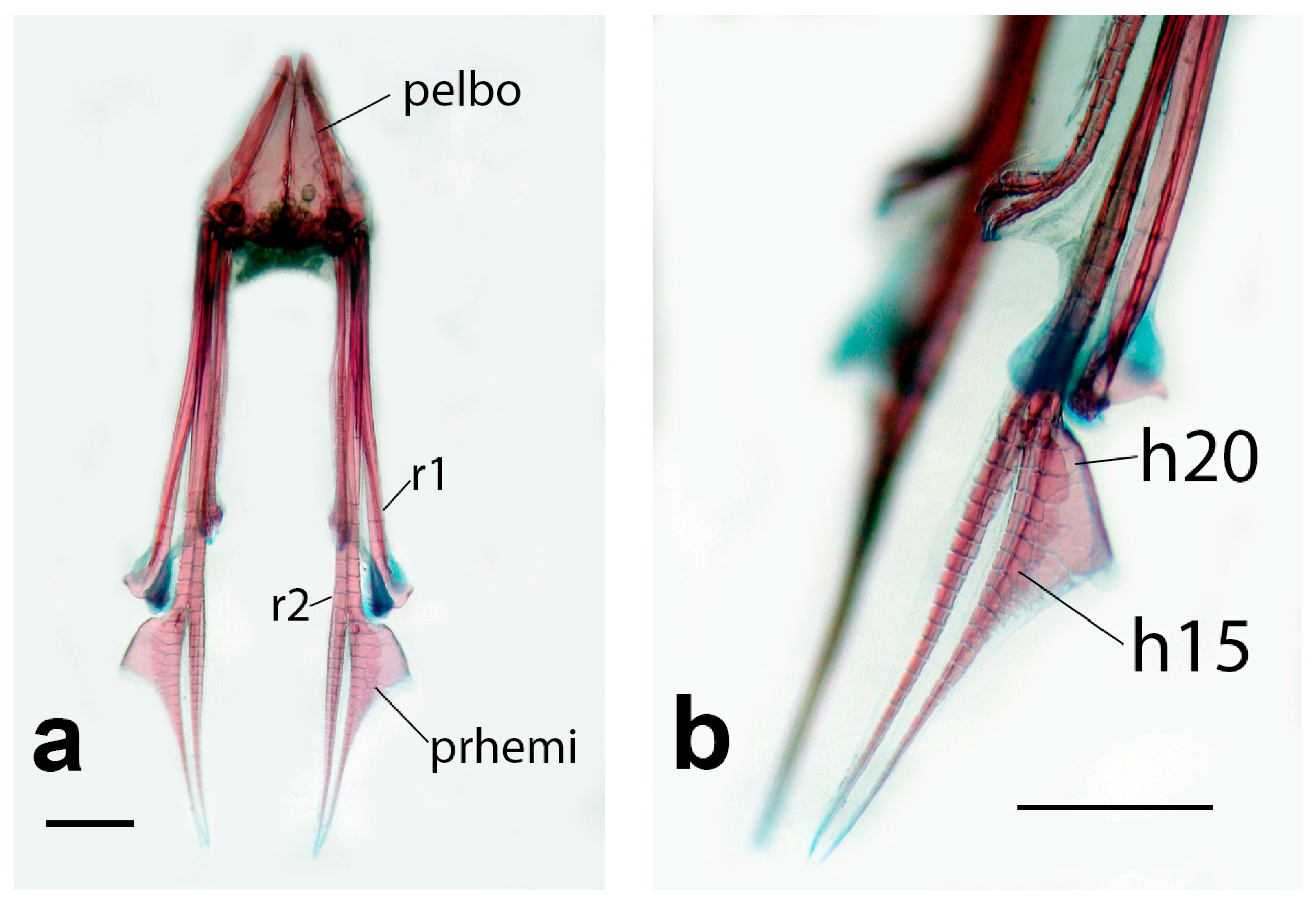 - Taylor, W.R.; Van Dyke, G.C. Revised procedures for staining and clearing small fishes and other vertebrates for bone and cartilage study. Cybium 1985, 9, 107–119. [Google Scholar]