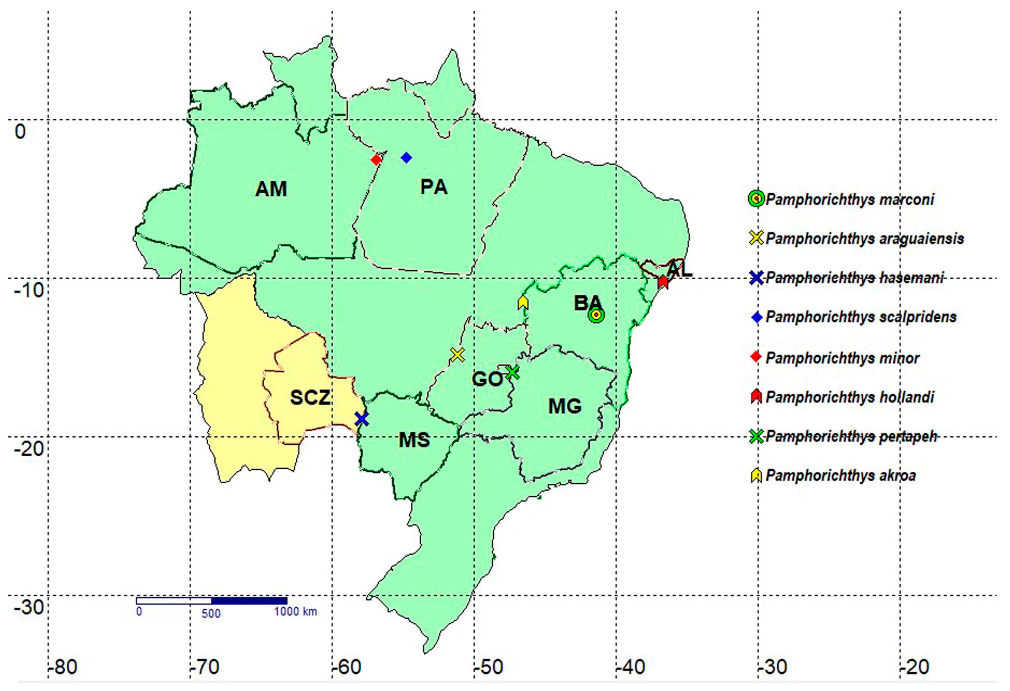 - Figueiredo, C.A.; Moreira, C.R. Poecilia (Pamphorichthys) akroa, a new poeciliid species (Cyprinodontiformes: Poeciliidae) from the Rio Tocantins basin, Brazil. Zootaxa 2018, 4461, 438–444. [Google Scholar] [CrossRef]
