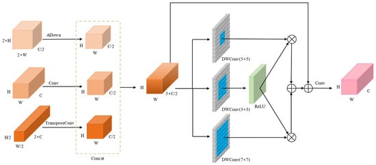 Standard multiscale feature fusion in YOLOv8 employs direct alignment followed by tensor concatenation. This approach fails to capture contextual information effectively, leading to significant feature-information loss during downsampling and alignment. To address this, we propose the MFFM, which uses parallel deep-wise separable convolution (DWConv) to simultaneously capture local contextual information at different scales. It constructs a feature-interaction gating mechanism through element-wise multiplication and addition, dynamically adjusting the weights of each branch to enhance feature interactions. Because the inherent information compression of convolution downsampling can easily lead to feature loss, this study incorporates ADown [24] into MFFM to handle high-resolution feature maps. The ADown module employs a dual-branch processing approach to preserve spatial details while extracting global semantics. It combines multiscale pooling to reduce information loss from downsampling, thereby improving small-object segmentation accuracy. The MFFM architecture is illustrated in Figure 5. The module receives three feature maps of different scales from layers P3, P4, and P5, denoted as high-resolution x1, medium-resolution x2, and low-resolution x3, respectively. x1 maintains its channel count through the lightweight ADown module, x2 aligns its channel count with that of x1 via standard convolution, and x3 is aligned with x1 through a transposed convolution and BatchNorm layer. The aligned feature maps are then concatenated to yield x′. Subsequently, a set of depth-separable convolutions is applied to obtain x1′, x2′, and x3′. x1′ is activated by the rectified linear unit (ReLU) activation function, multiplied element-wise with x2′ and x3′, and then summed to obtain x″. This result is connected to x1′ via a residual connection and convolved to align the channel counts with the P4 layer, yielding the final output xout. The MFFM operation is formulated as follows: