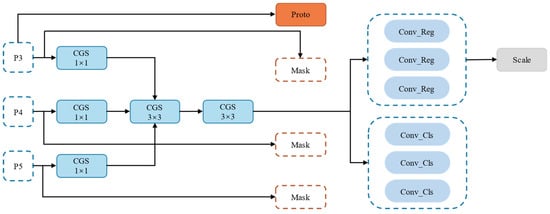 The segmentation head of YOLOv8-seg comprises a detect branch, which predicts bounding boxes and classes, and a mask branch, which generates mask coefficients and prototypes. In the original model, each of the three output heads of the detect branch uses four 3 × 3 convolutions and two 1 × 1 convolutions, significantly increasing the network parameters and negatively impacting inference efficiency. To reduce the number of parameters and computational complexity, this study adopts shared convolutions in the detection branch and proposes the SLL-Head, which aggregates inputs from three feature layers into a shared convolutional layer for feature extraction. To address objects of different scales, the regression branch uses scale layers for feature scaling. Additionally, the original batch normalization (BatchNorm) in the convolution module is replaced with group normalization (GroupNorm) to construct the Conv-GroupNorm-SiLU (CGS) module. This grouping strategy reduces computational complexity while preserving channel correlations within a group, thereby preventing excessive feature smoothing. The improved detect branch structure is shown in Figure 9.