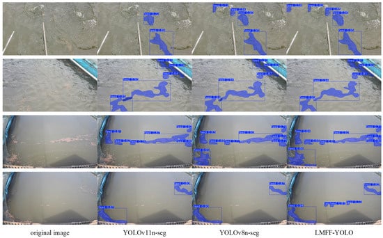 To visually observe the model’s practical performance, we randomly selected images from the test set for instance segmentation, as shown in Figure 11. Although YOLOv8n-seg and YOLOv11n-seg detected residual feed, they exhibited issues such as missed detections and duplicate segmentations. Their capture ability and accuracy for small targets are particularly weak. By contrast, LMFF–YOLO can more accurately segment small targets and complex residual feed clusters without duplicate segmentation, validating its higher stability and robustness and offering clear advantages in handling blurred boundaries.