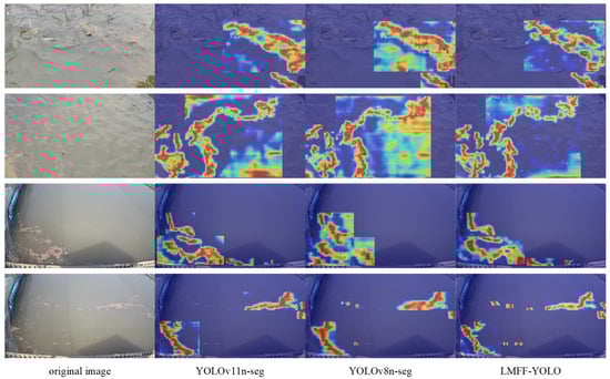 To further investigate the decision-making mechanisms and feature-focused characteristics of the different models, we employed gradient-weighted class activation mapping (Grad-CAM) for a visual comparative analysis. This approach reveals differences in attention distribution during the models’ recognition processes. In the heatmaps, areas ranging from yellow to deep red denote regions receiving heightened attention. This study selected typical image samples characterized by high background complexity, dense residual feed distribution, and weak boundary continuity. In such images, residual feed tends to be visually confused with the surrounding environment, posing a significant challenge to a model’s discrimination capabilities. The heatmaps shown in Figure 12 demonstrate that the high-response areas (red) generated by LMFF–YOLO heatmaps closely align with the actual shapes of the residual feed. This is particularly evident in the model’s ability to focus on small-scale targets, effectively separating the feed from the complex background. By contrast, the YOLOv8n-seg heatmap reveals significant misdirected attention toward the background or other irrelevant objects. While YOLOv11n-seg demonstrates more focused attention, its alignment with the actual residual feed contours remains inadequate. By contrast, LMFF–YOLO significantly enhances feature discrimination between targets and backgrounds while reducing false activations from the background. These results demonstrate that LMFF–YOLO outperforms the comparison models in multiscale feature fusion, fuzzy-boundary perception, robustness to complex backgrounds, and resistance to noise interference, exhibiting a more stable and precise segmentation performance.