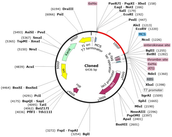 The codon optimization of the MCV sequence was conducted to enhance expression in E. coli (Table 4). The nucleotide sequence comprising 1259 bases achieved a G+C content of 54.61%, which is within the ideal range of 30% to 70% for stable DNA structure and efficient transcription and translation in microbial systems [79,80]. Furthermore, the Codon Adaptation Index (CAI) was calculated to be 1, indicating optimal compatibility with the host translational machinery. This high CAI value suggests that the vaccine will likely be expressed efficiently in E. coli, maximizing protein yield and stability. The MCV gene was codon-optimized and inserted into the pET30a (+) vector, resulting in the pEZ317 vector. The corresponding plasmid map of pEZ317 highlights the location of the MCV insert (Figure 2).