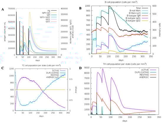 The C-ImmSim server (https://kraken.iac.rm.cnr.it/C-IMMSIM/index.php?page=0; accessed on 31 December 2025) was used to simulate the immunogenicity of the MCV construct. This tool is designed to mimic the dynamics of an immune system responding to vaccination. The model integrates a position-specific scoring matrix (PSSM) for predicting immune epitopes and employs machine learning to forecast interactions between different immune components [62]. The vaccination regimen was simulated with up to four injections, each administered at 28-day intervals, specifically on days 0, 28, 56, and 84. In the simulation, these time points correspond to steps 1, 84, 168, and 252, with each time step representing 8 h post-immunization. This time-step conversion allows the model to closely mimic the timing of real immune responses [63]. Each injection delivered 1 unit of vaccine in a simulated volume of 100 µL. The entire immune response was modeled over 100 simulation steps to assess the progression of antigen presentation and antibody production. All other parameters, including cell counts, antigen presentation, and immune cell replication dynamics, were set to default, unless otherwise specified. The output data from C-ImmSim were processed to analyze immune cell populations over time, including B cells, T cells, and their respective states (e.g., active, duplicating, resting, and anergic).