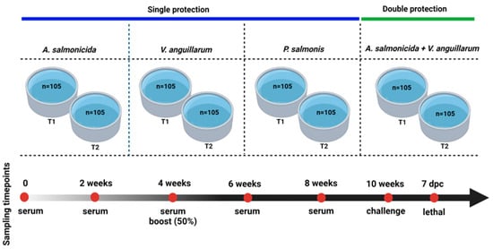 At 10 wpi, the immunized lumpfish were subjected to pathogen challenge tests to evaluate the MCV efficacy against three individual bacterial pathogens, V. anguillarum, A. salmonicida, and P. salmonis. Also, an additional co-infection challenge with V. anguillarum and A. salmonicida was conducted. The challenge dose was 104 CFU/100 μL via i.p. injection for P. salmonis and bath challenge for V. anguillarum and A. salmonicida. Survival was monitored daily for up to 30 days post-challenge for all groups and 90 days post-challenge for the group challenged with P. salmonis. The relative percentage survival (RPS) was calculated according to the formula: 1 − (% mortalities of vaccinated fish/% control mortalities) × 100 [69].