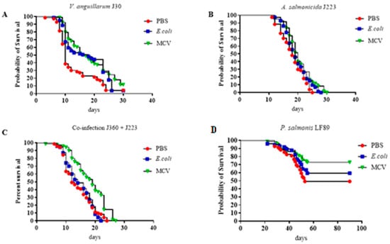 Survival curve for Multiepitope Chimeral Vaccine trials. (A) Challenged with V. anguillarum (B) Challenged with A. salmonicida (C) Challenged with Coinfection with V. anguillarum and A. salmonicida. (D) Challenged with P. salmonis LF89. The trial was conducted in duplicates with a bacterial dose of 104. The calculated RPS for the MCV-treated group challenged with V. anguillarum, A. salmonicida, P. salmonis, and the group coinfected with V. anguillarum and A. salmonicida is 27.8%, 21.1%, 44.4%, and 33.3%, respectively. Survival data were analyzed using Kaplan–Meier survival curves with log-rank tests to compare the differences between treated and control groups. There was no significant difference across treatments (p > 0.05).