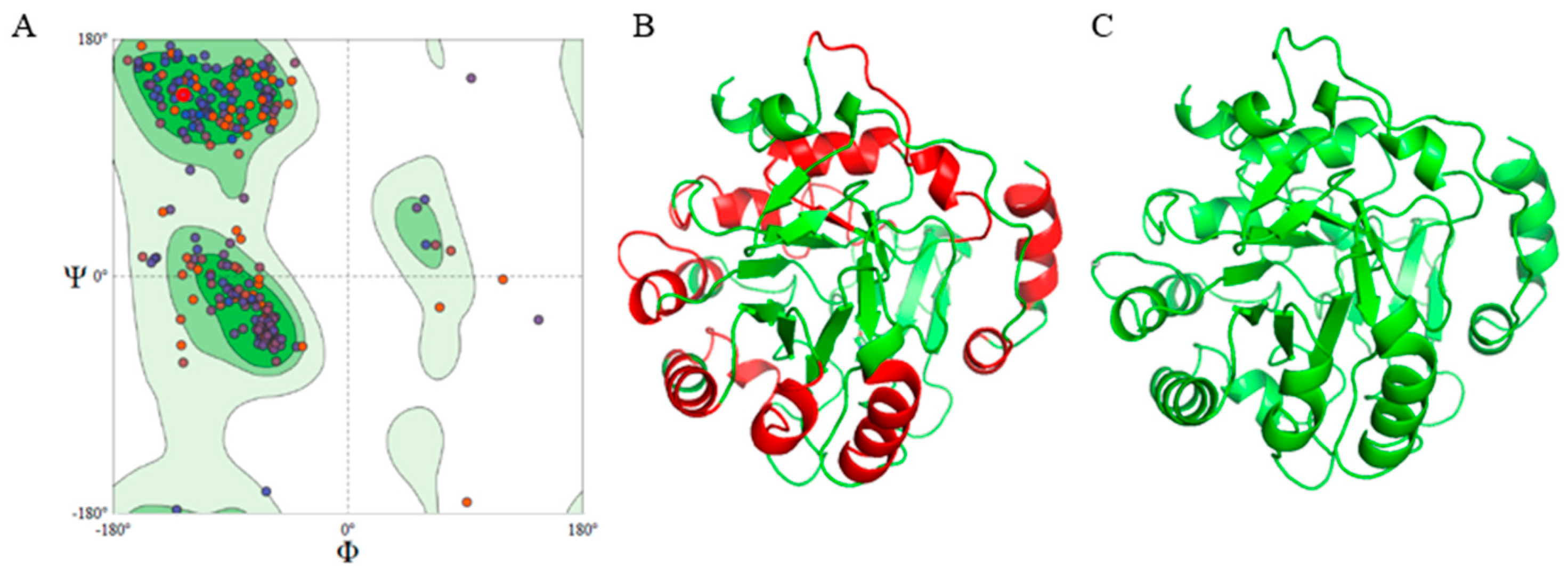 - Chen, V.B.; Arendall, W.B., 3rd; Headd, J.J.; Keedy, D.A.; Immormino, R.M.; Kapral, G.J.; Murray, L.W.; Richardson, J.S.; Richardson, D.C. MolProbity: All-atom structure validation for macromolecular crystallography. Acta Crystallogr. D Biol Crystallogr. 2010, 66, 12–21. [Google Scholar] [CrossRef] [PubMed]