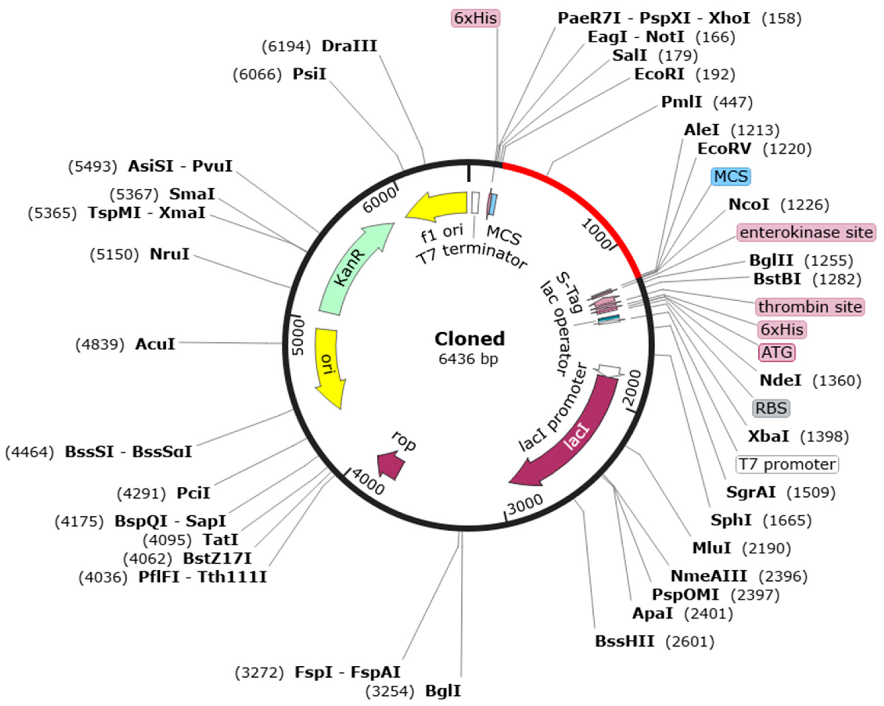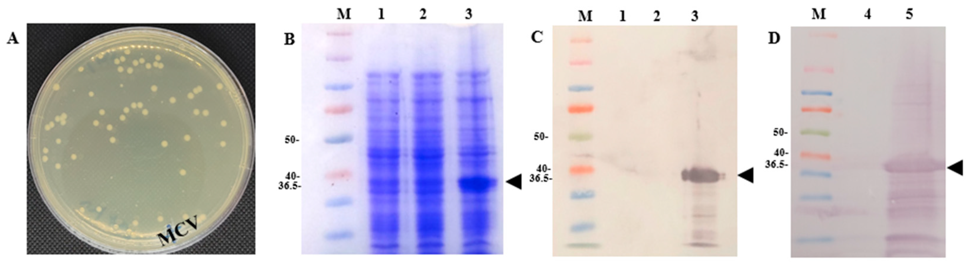 2.6. Transformation of E. coli with a Recombinant Plasmid Harboring the MCV