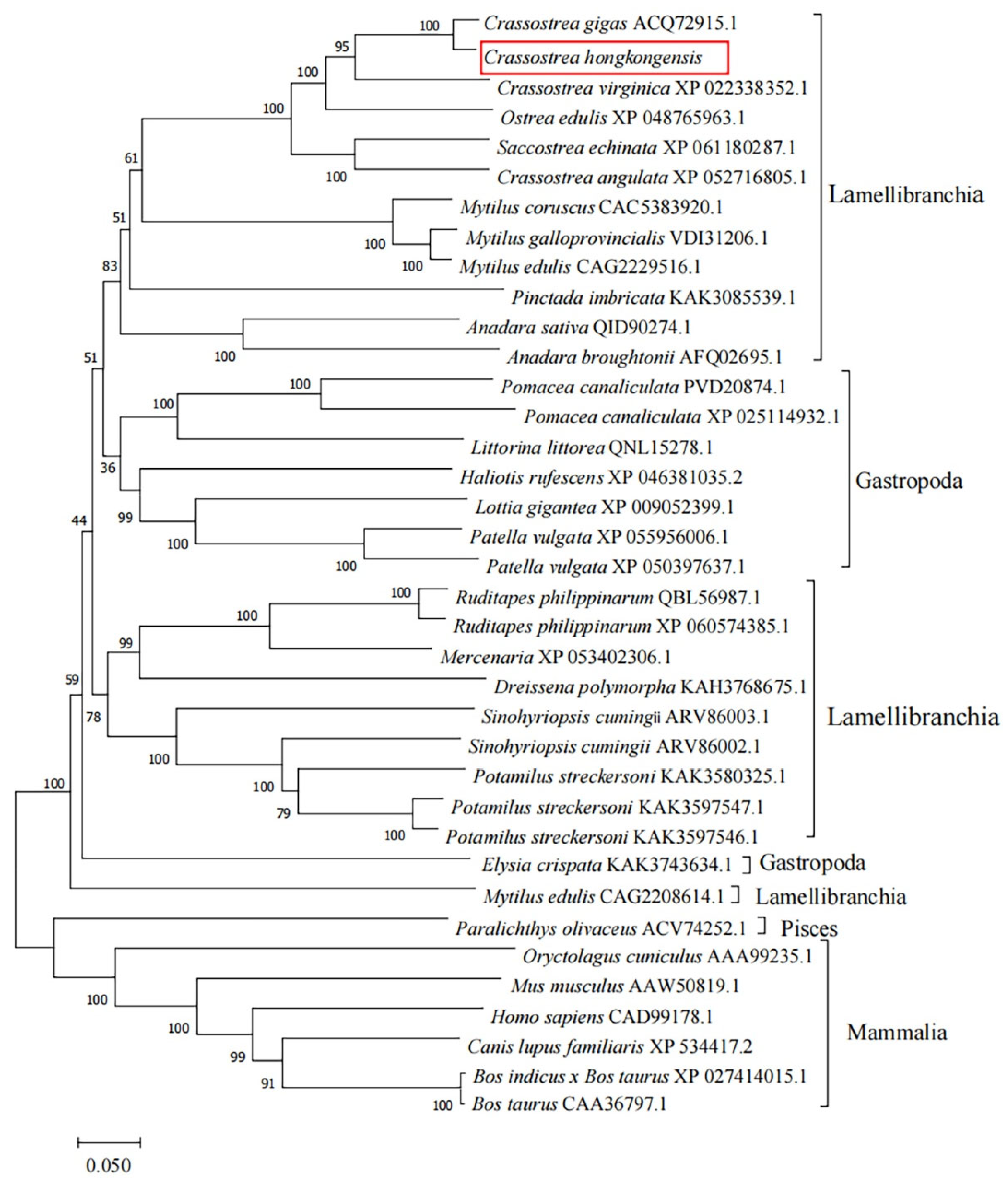 - Xie, W.; Zhou, Q.-J.; Xu, Y.-X.; Zhang, M.; Zhong, S.-P.; Lu, L.-L.; Qiu, H.-T. Transcriptome analysis reveals potential key immune genes of Hong Kong oyster (Crassostrea hongkongensis) against Vibrio parahaemolyticus infection. Fish Shellfish. Immunol. 2022, 122, 316–324. [Google Scholar] [CrossRef]