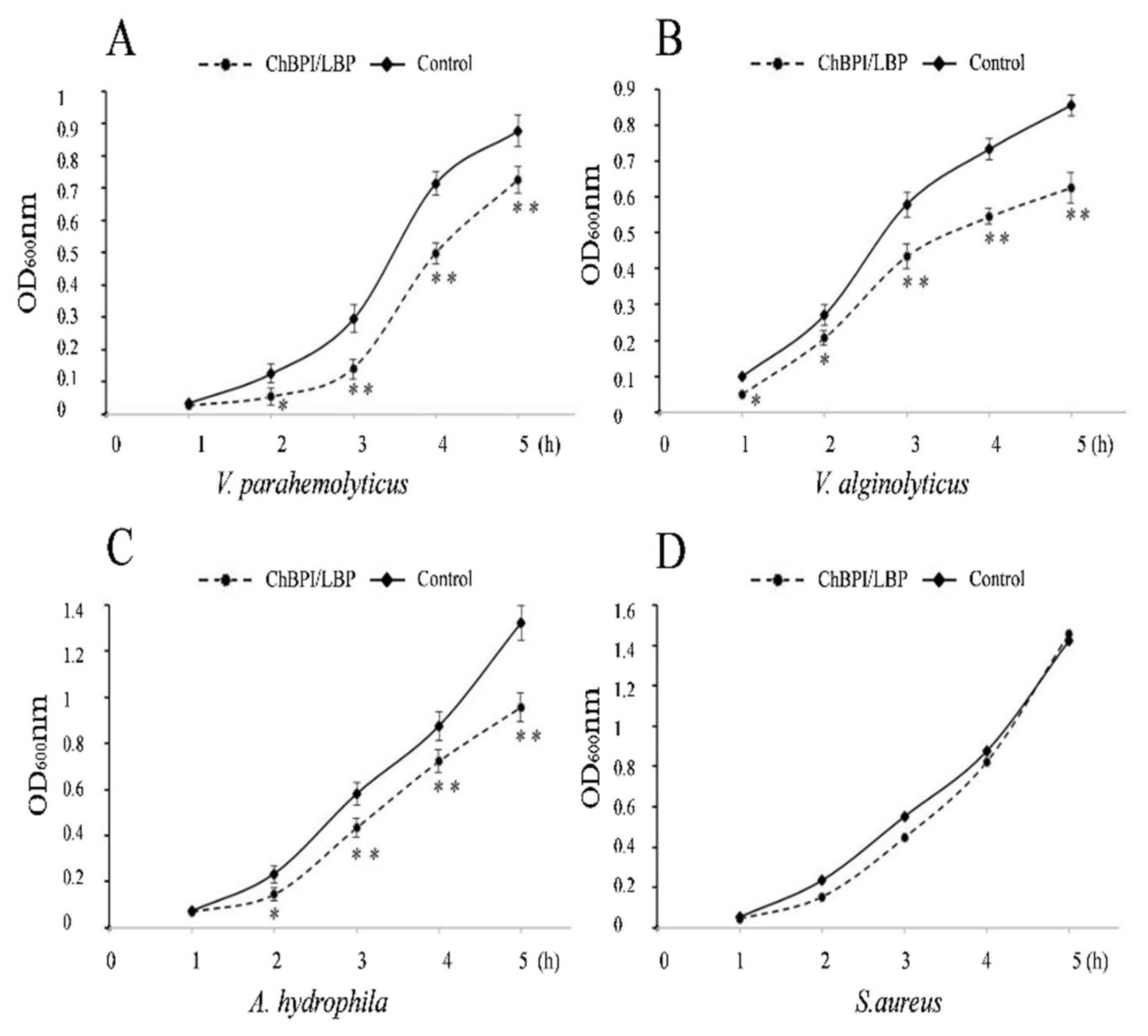 3.5. Recombinant ChBPI/LBP Possesses Potent and Specific Antibacterial Activity