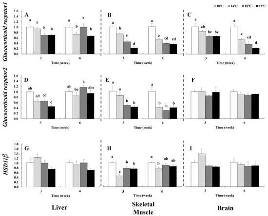 Relative mRNA expression of glucocorticoid receptors and 11-β hydroxysteroid dehydrogenase 2 (HSD11β) in the liver, skeletal muscle and brain of chum salmon (Oncorhynchus keta) after exposure to 10, 14, 18 and 22 °C for 3 and 6 weeks. Error bars represent the standard error of the mean (n = 3 tanks). Different letters denote significant differences among temperatures and exposure duration, as determined by two-way ANOVA followed by Duncan’s multiple range test. Panels (A–I) show gene-specific expression profiles.