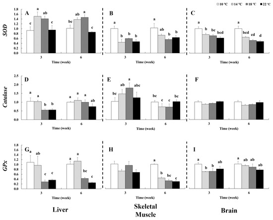 Relative mRNA expression of Cu/Zn Superoxide dismutase (SOD), catalase, and glutathione peroxidase (GPx) in the liver, skeletal muscle and brain of chum salmon (Oncorhynchus keta) after exposure to 10, 14, 18 and 22 °C for 3 and 6 weeks. Error bars represent the standard error of the mean (n = 3 tanks). Different letters denote significant differences among temperatures and exposure duration, as determined by two-way ANOVA followed by Duncan’s multiple range test. Panels (A–I) show gene-specific expression profiles.