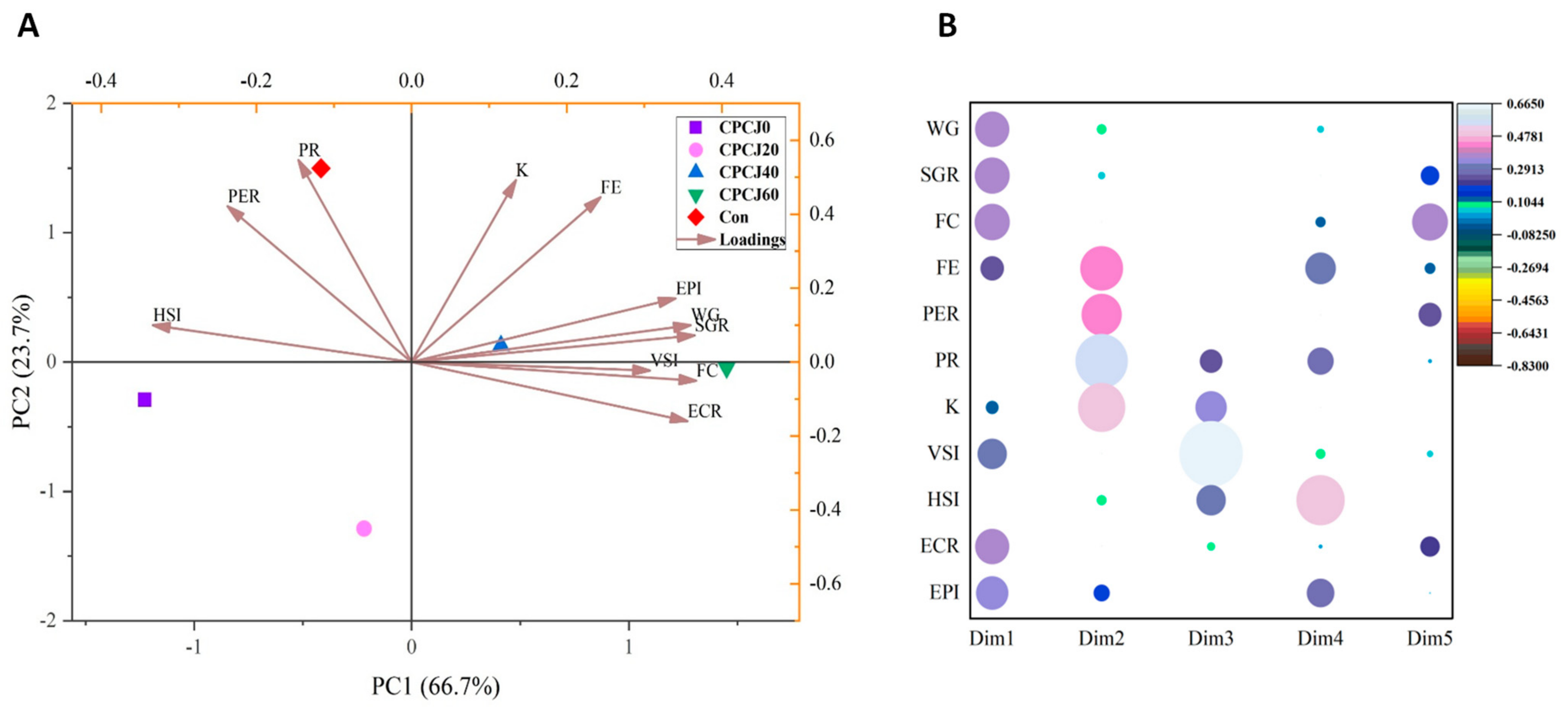 | Experimental Diets | Initial Weight (g/Fish) | Final Weight (g/Fish) | Survival (%) | FE 1 | PER 2 | PR 3 (%) | K 4 (g/cm3) | VSI 5 (%) | HSI 6 (%) |
