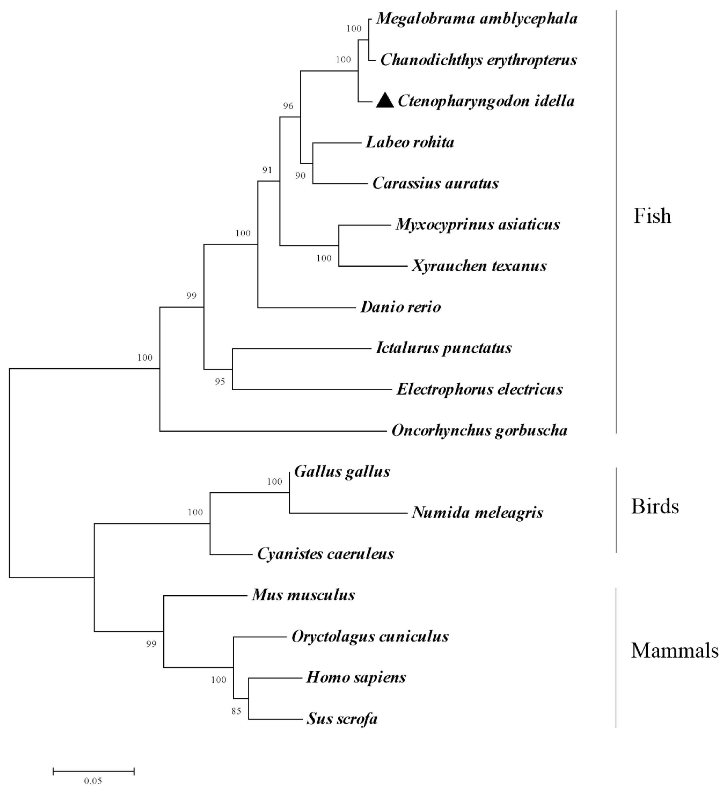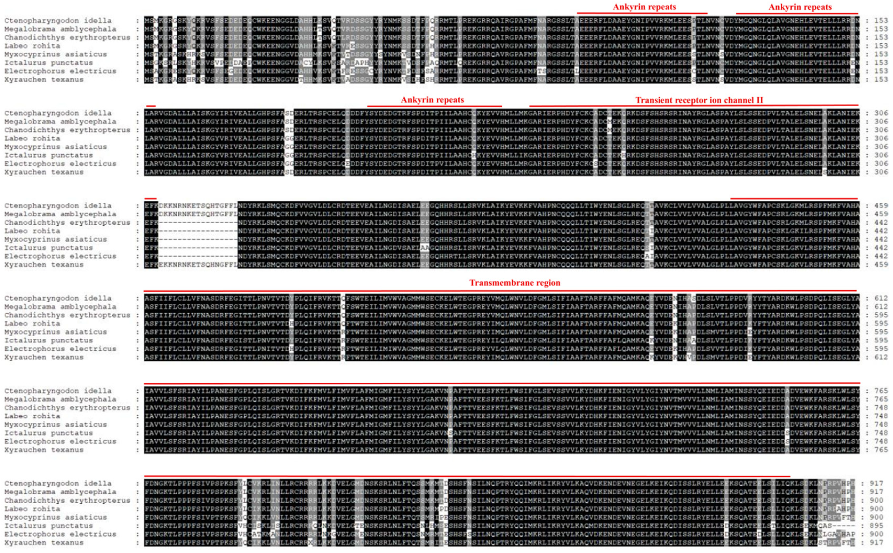 3.1. Sequence Analysis and Phylogenetic Tree of Grass Carp trpc3 cDNA