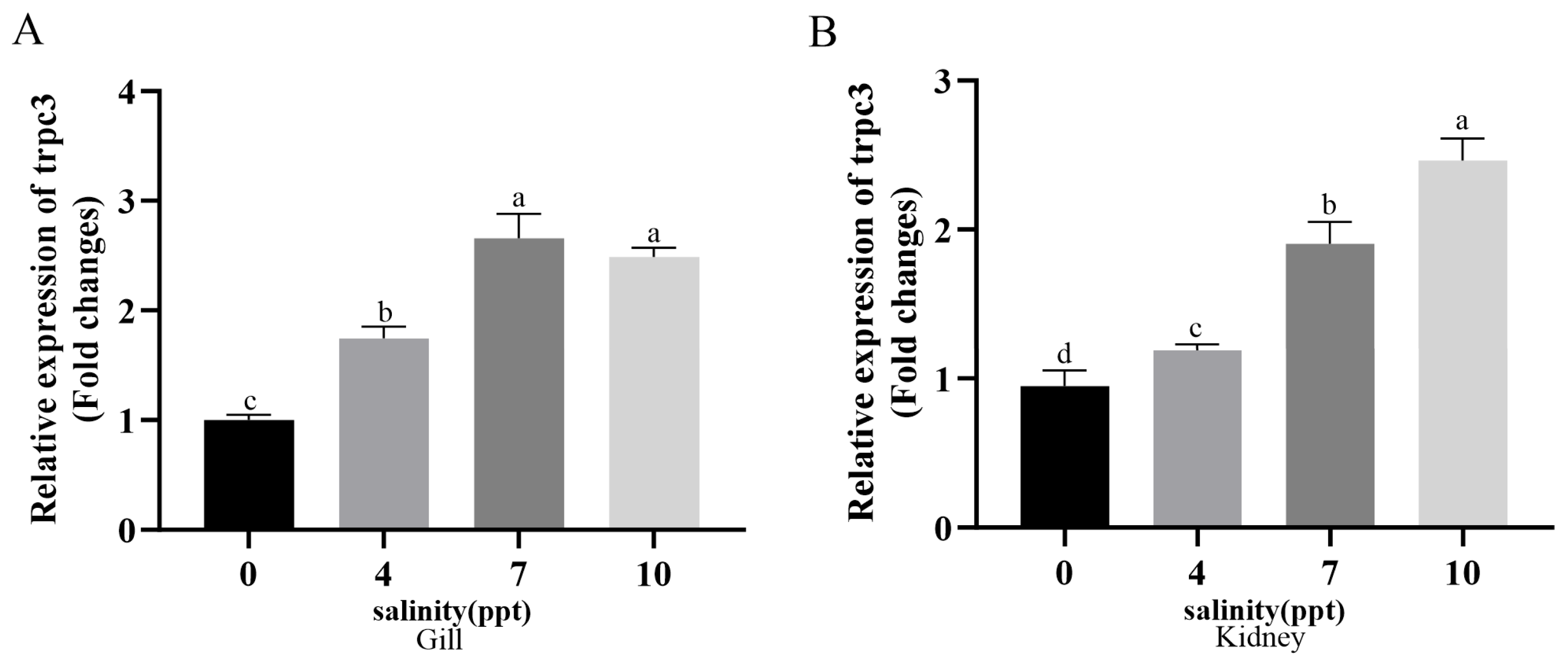 3.3. Changes in trpc3 mRNA Expression in Grass Carp Under Different Salinity Stress