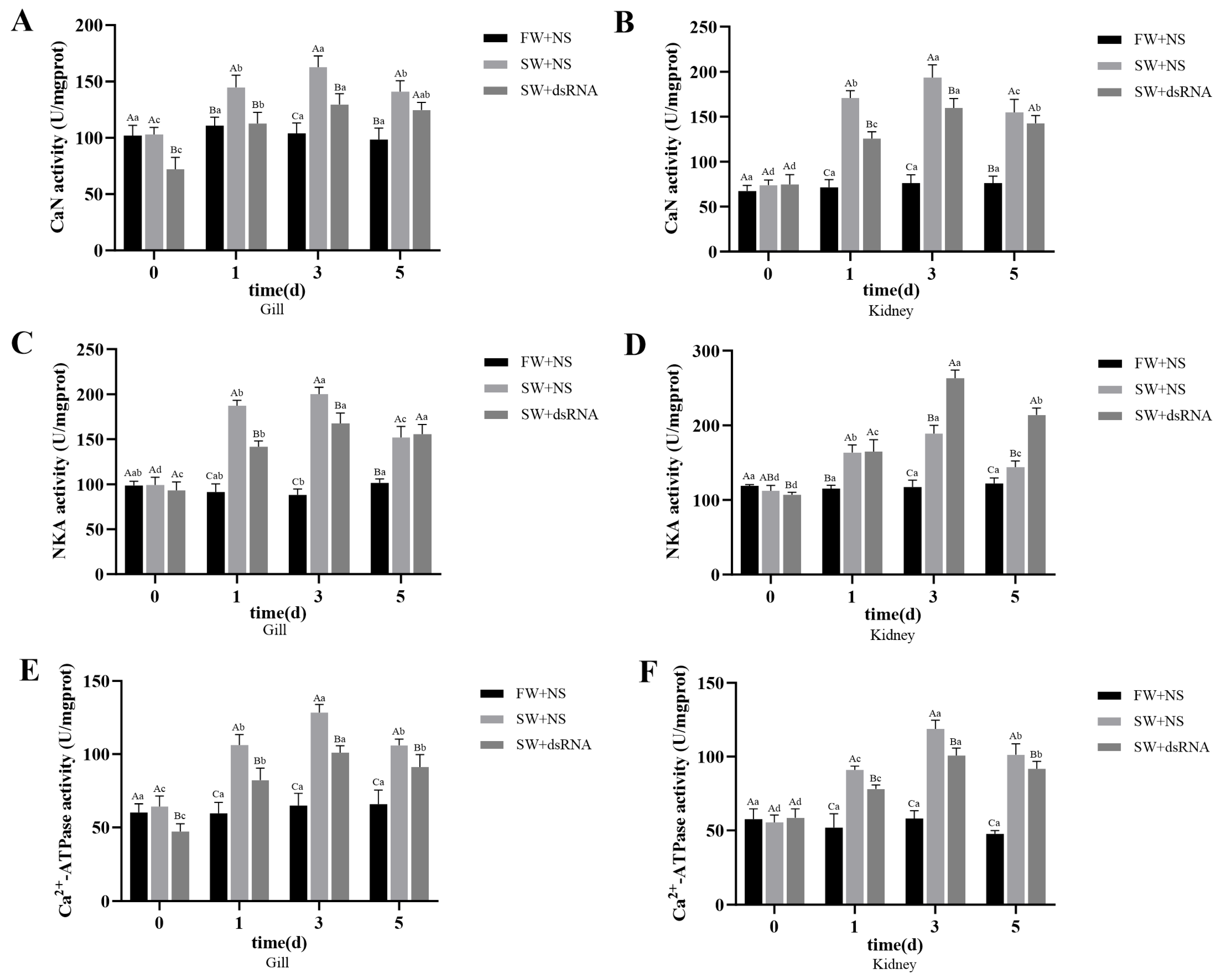 3.6. Enzyme Activity in the Gills and Kidney