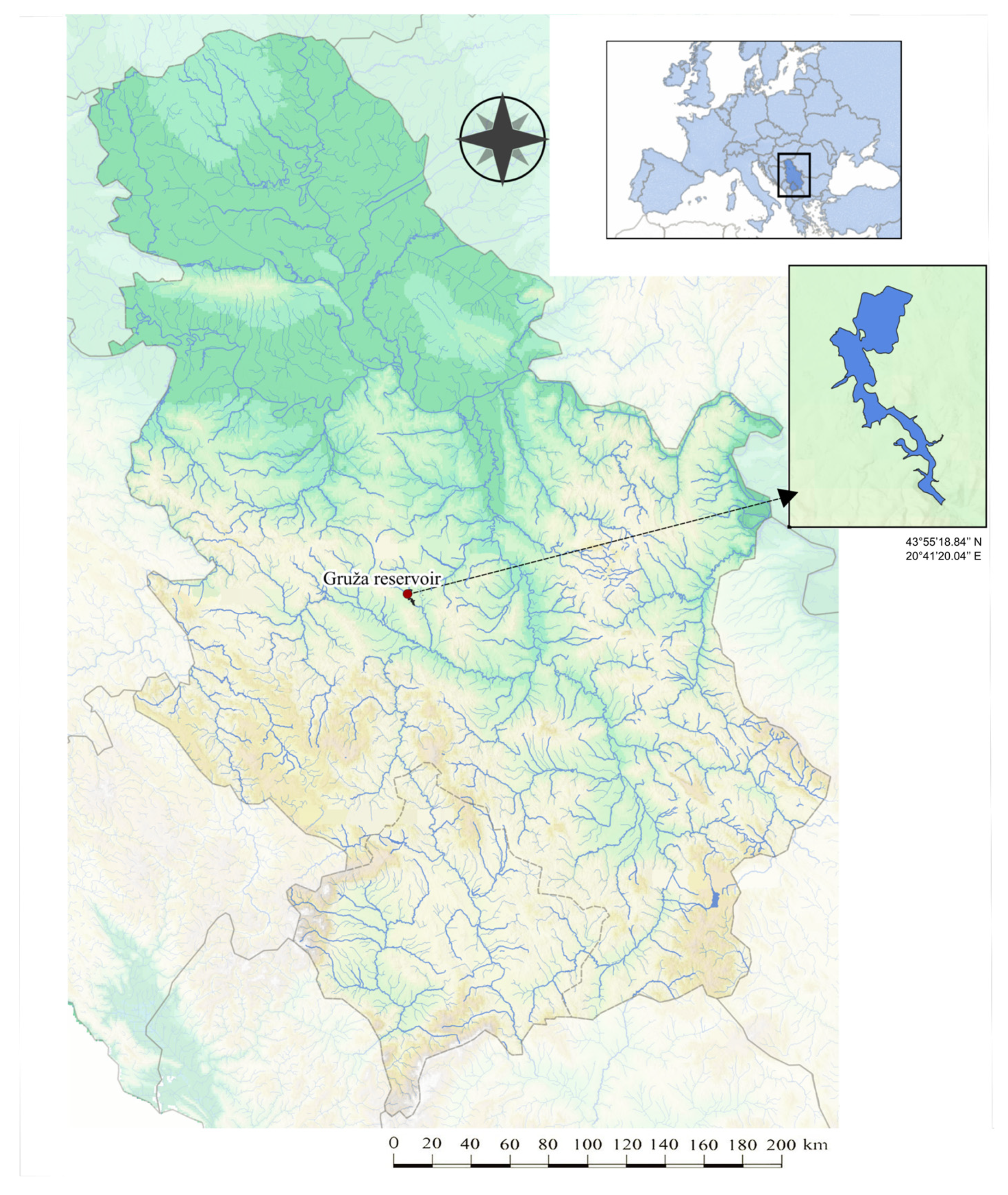 - Simić, V.; Simić, S.; Petrović, A.; Radojković, N.; Veličković, T.; Matejić, B.; Vlajković, M. Program Upravljanja Ribarskim Područjem “Velika Morava 1” (2017–2026); Prirodno-Matematički Fakultet, Univerzitet u Kragujevcu: Kragujevac, Serbia, 2017. (In Serbian) [Google Scholar]