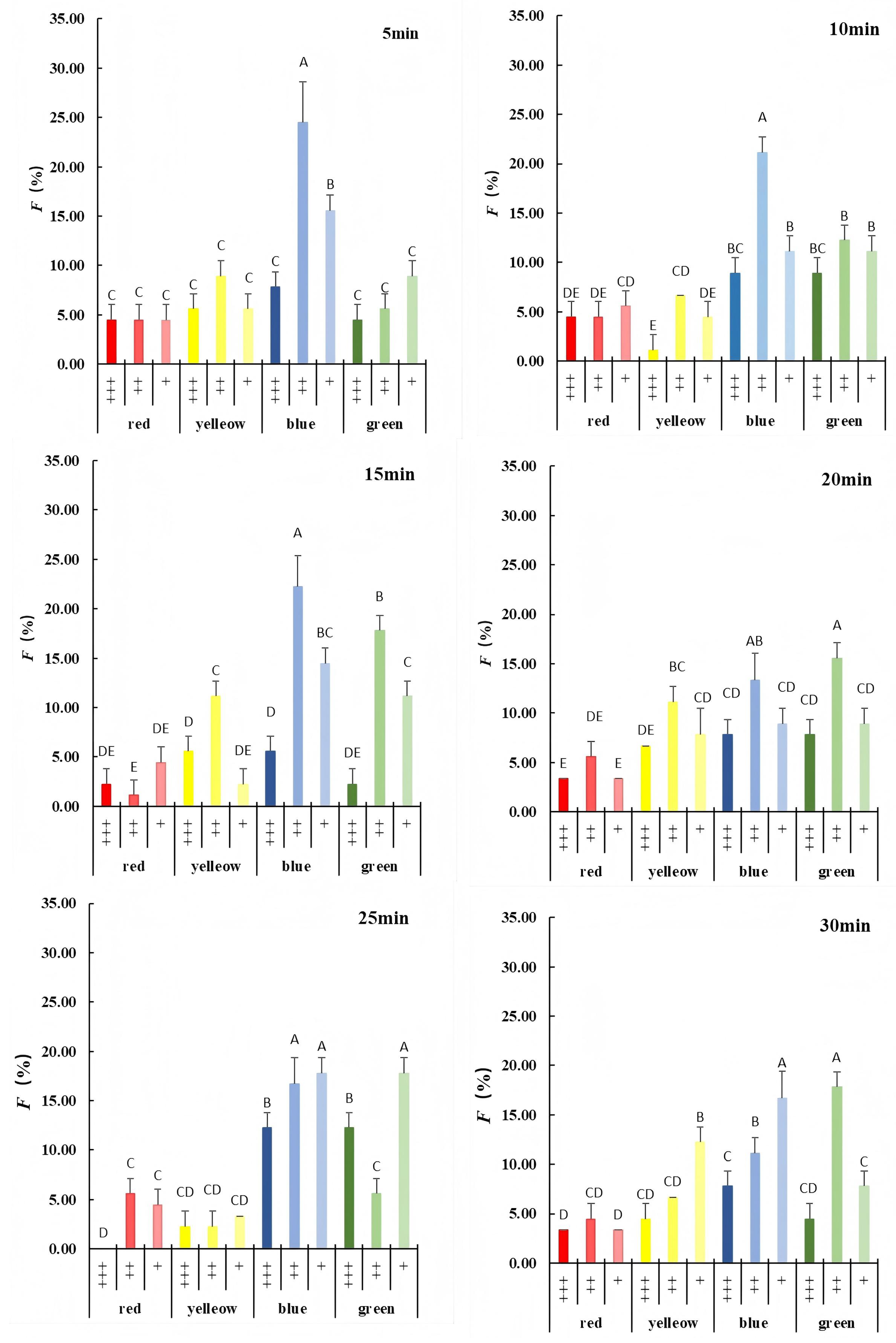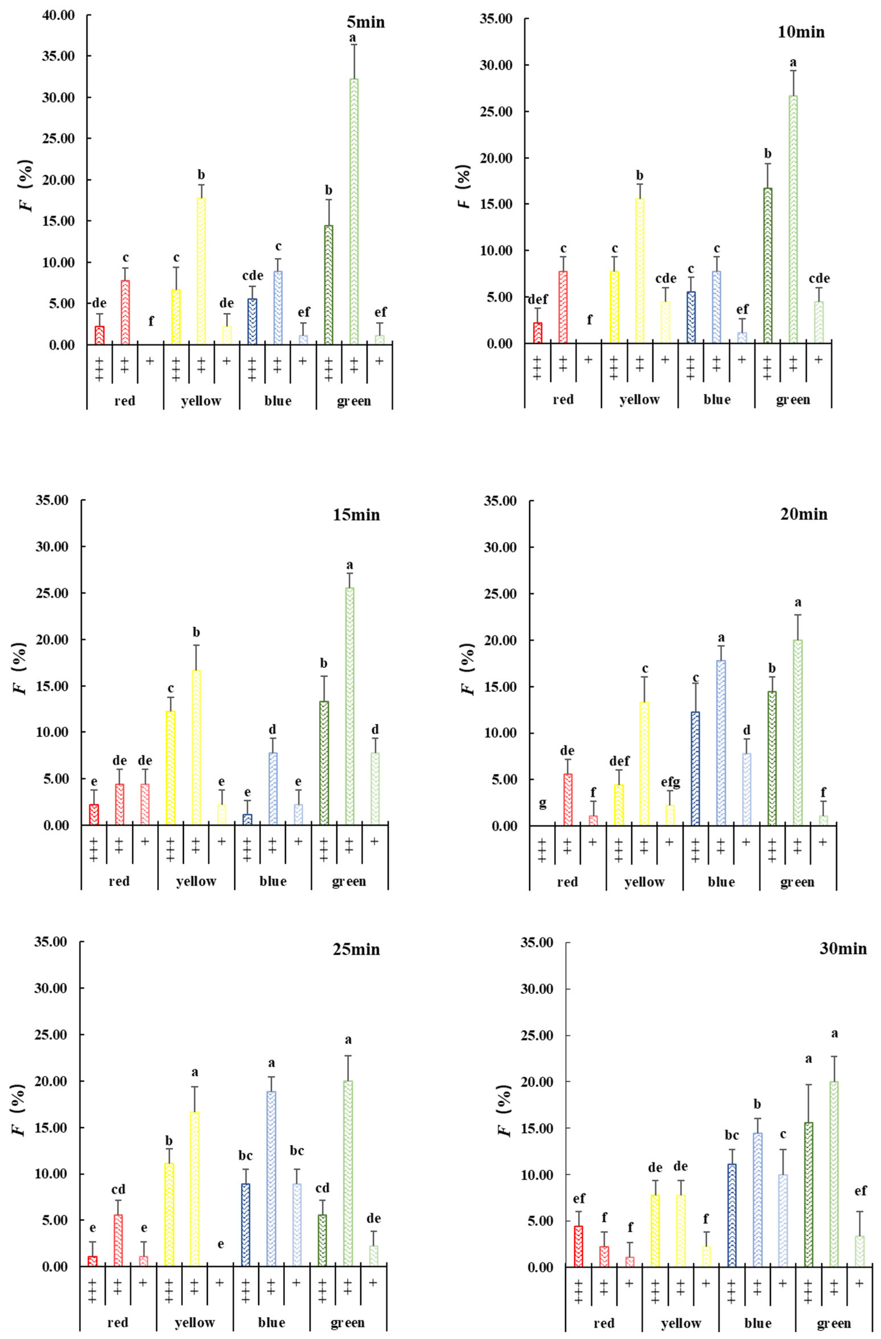 | green | 27.78 ± 1.57 a | 21.11 ± 1.57 b | 20.00 ± 2.72 b | 25.56 ± 1.57 a | 37.78 ± 1.57 a | 34.44 ± 1.57 a | |