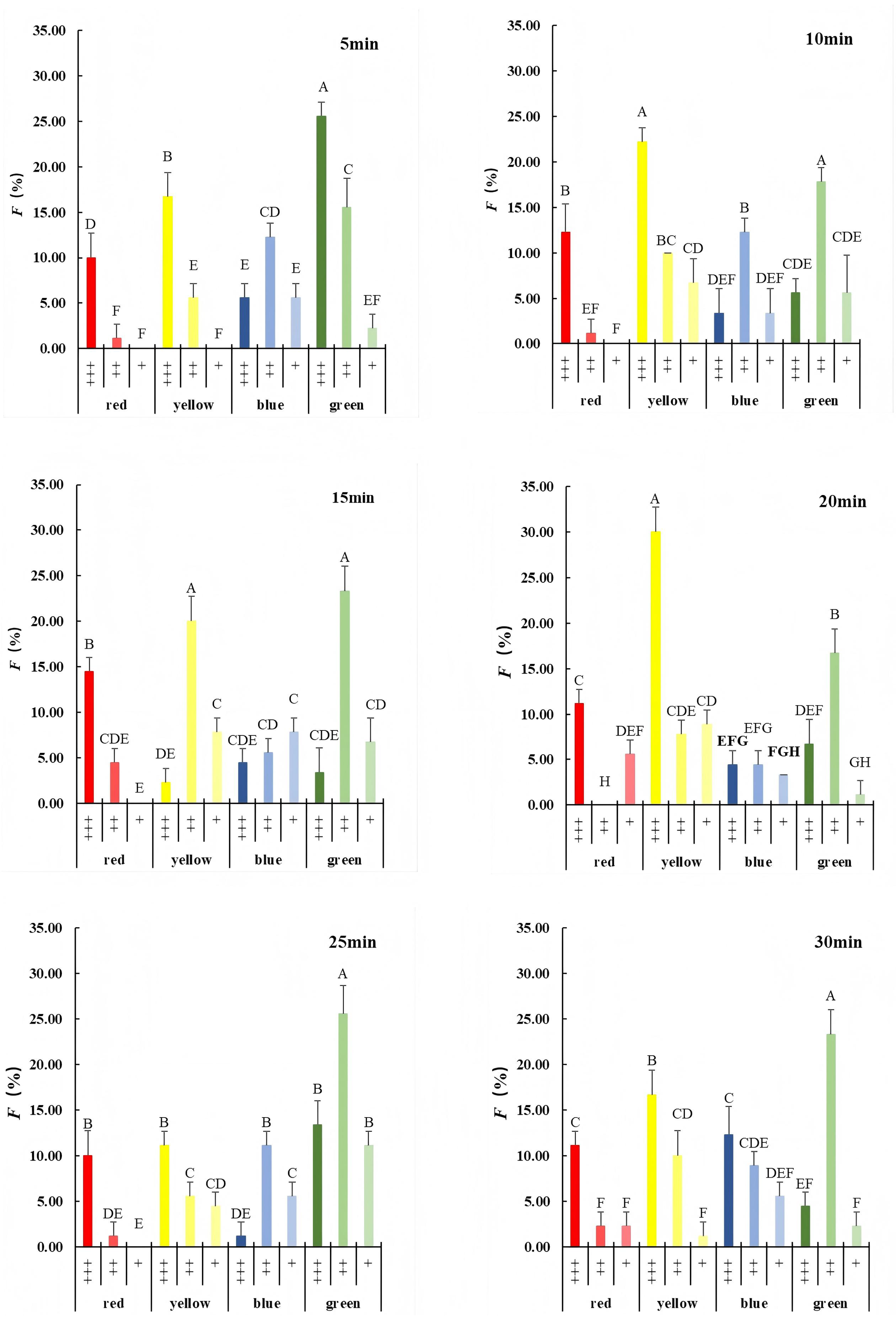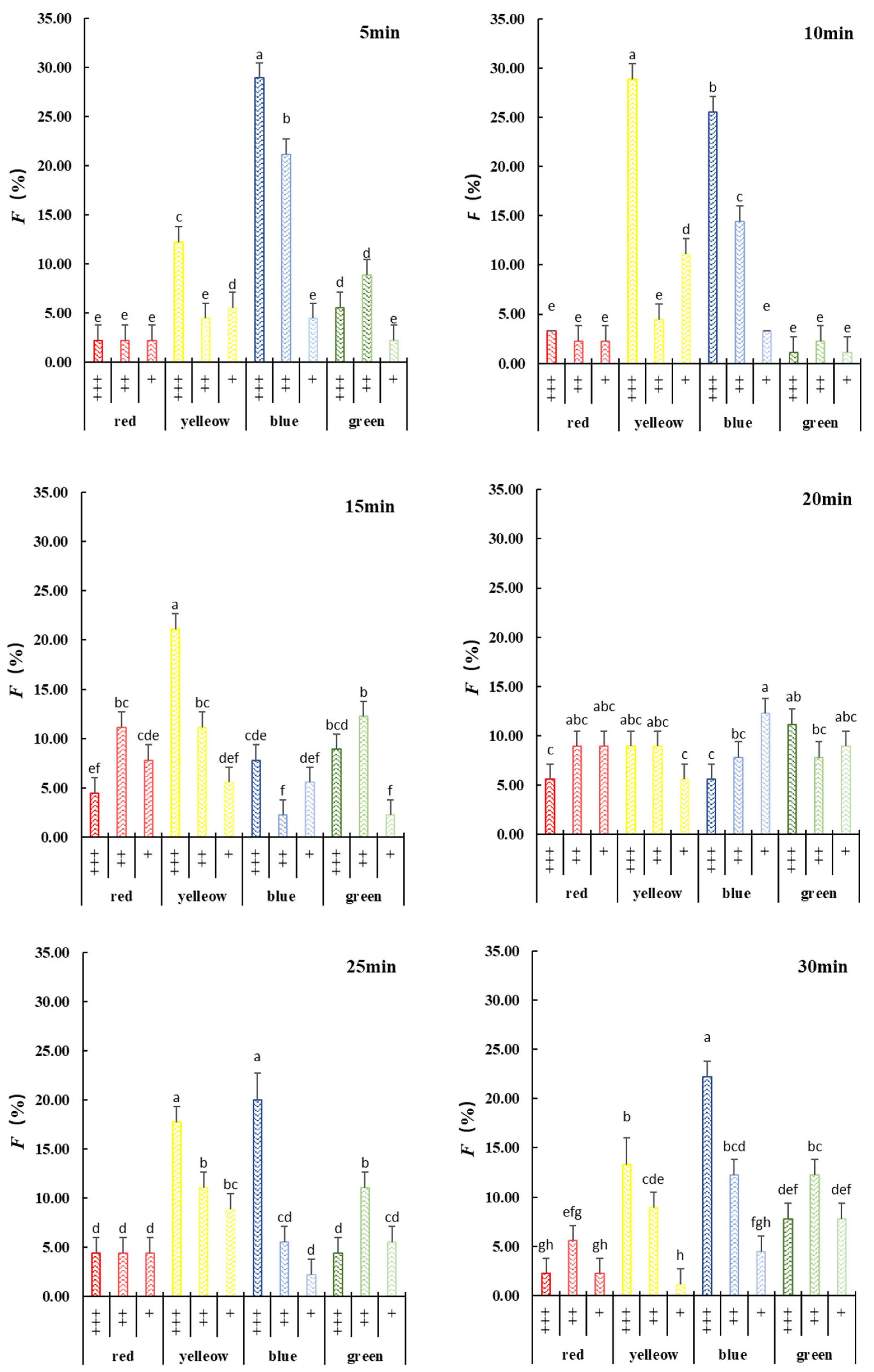 | yellow | 16.67 ± 2.72 c | 13.33 ± 2.72 bc | 16.67 ± 2.72 bc | 22.22 ± 1.57 a | 16.67 ± 2.72 b | 21.11 ± 1.57 a | |