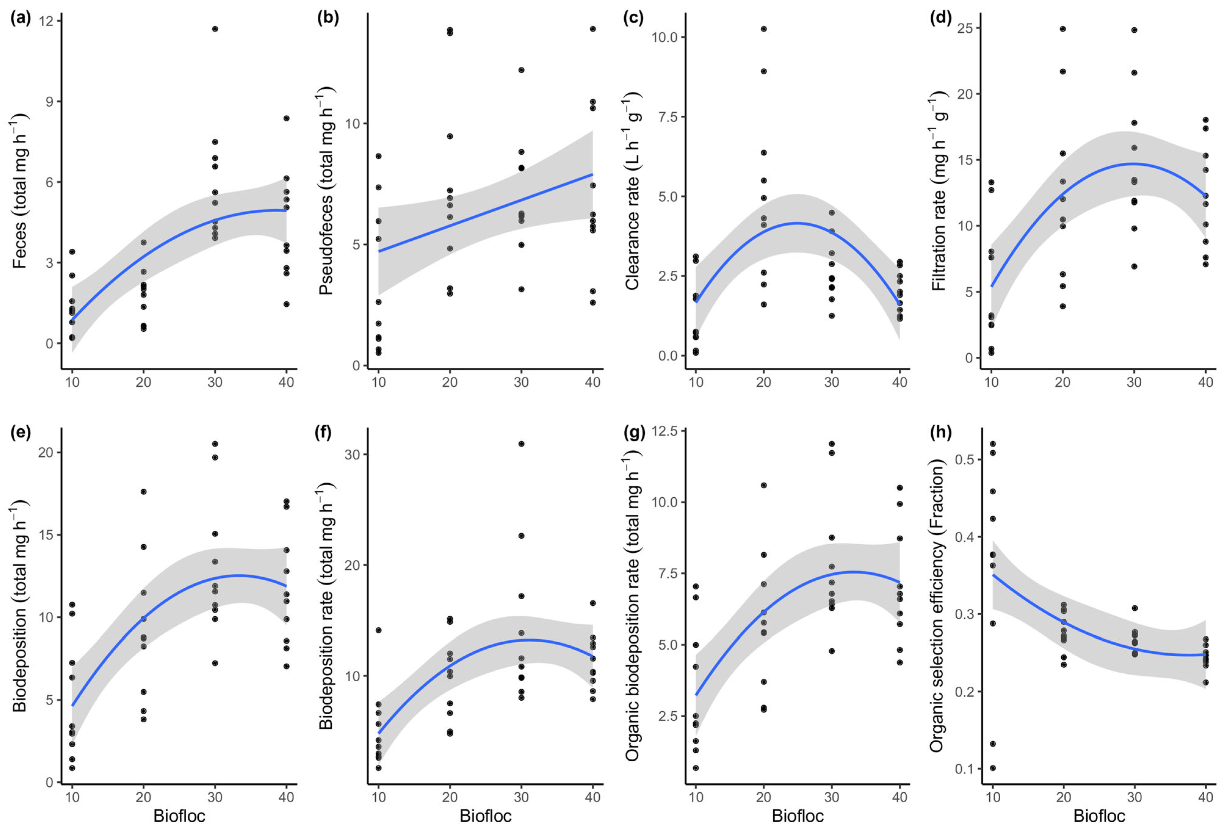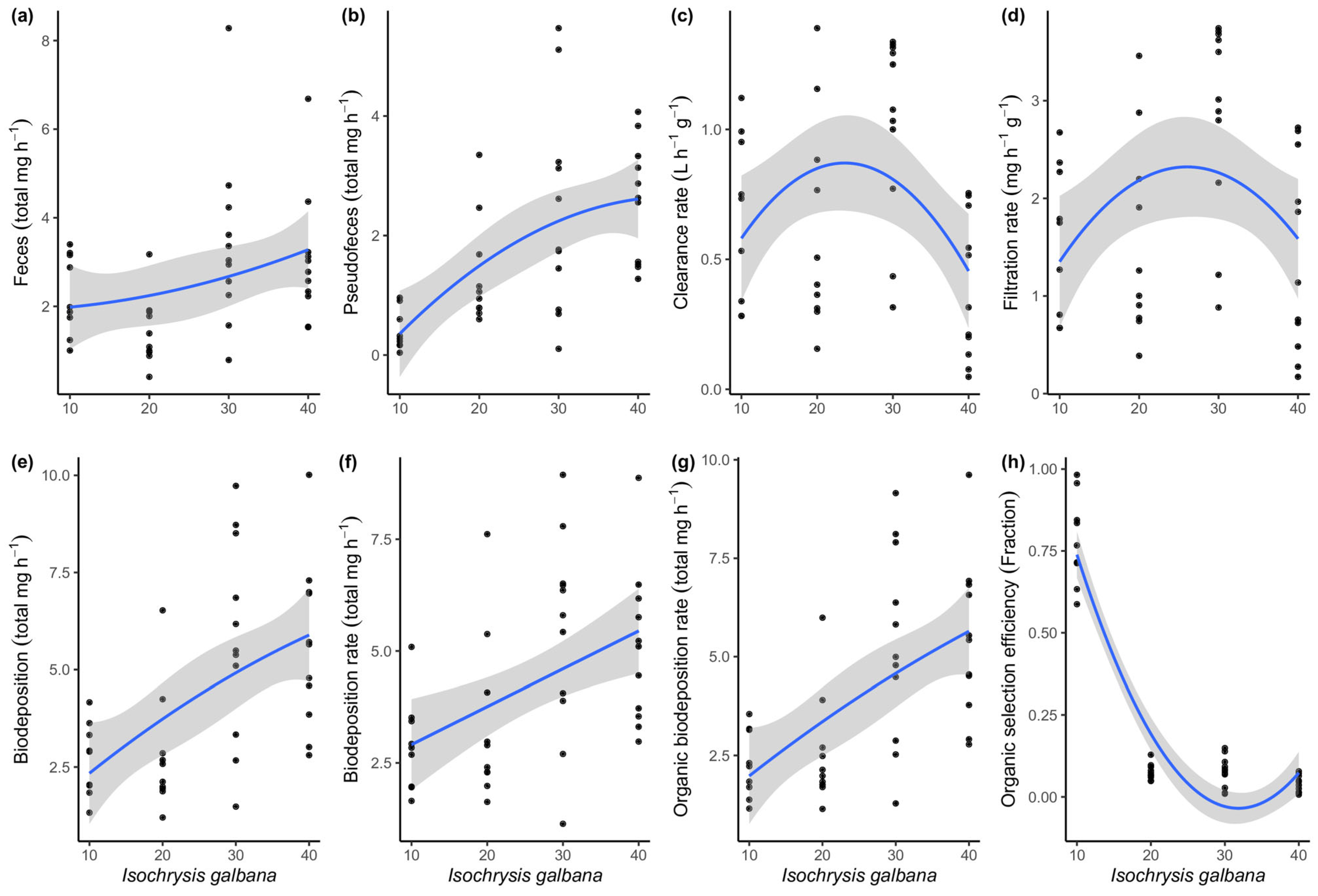 | Organic biodeposition rate (total mg h−1) | OBDR | (mg total feces egested h−1 × organic fraction of feces) + (mg total pseudofeces h−1 × organic fraction of pseudofeces) |