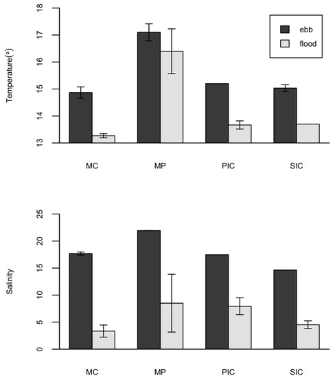 - Gonçalves, R.; Correia, A.D.; Atanasova, N.; Teodósio, M.A.; Ben-Hamadou, R.; Chícharo, L. Environmental factors affecting larval fish community in the salt marsh area of Guadiana estuary (Algarve, Portugal). Sci. Mar. 2015, 79, 25–34. [Google Scholar] [CrossRef]