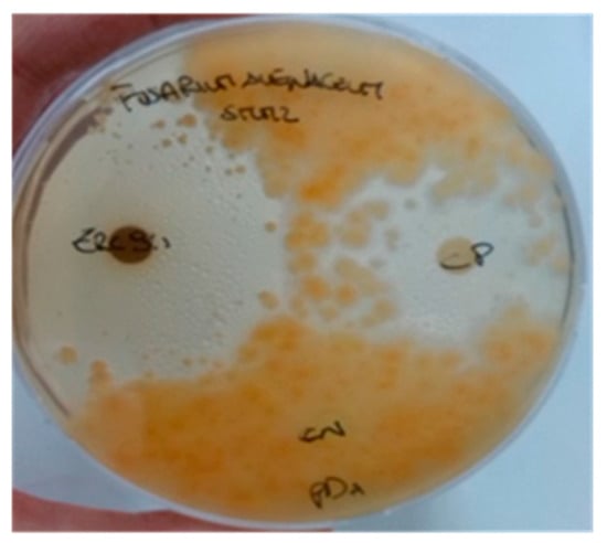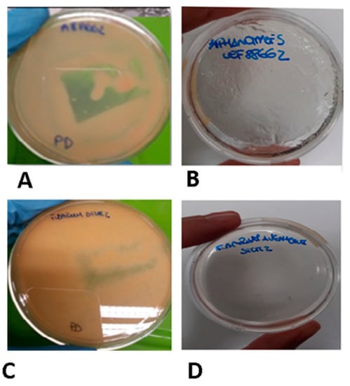 To verify the sporicidal effect of the Zr-b extract, a spore germination inhibition assay was performed in vitro with 320 µg/µL chloroform–methanol (9:1) Zr-b extract. After the appropriate incubation, no development of viable colonies of Aphanomyces astaci and Fusarium avenaceum was observed on media supplemented with the Zr-b extract (Figure 5)
