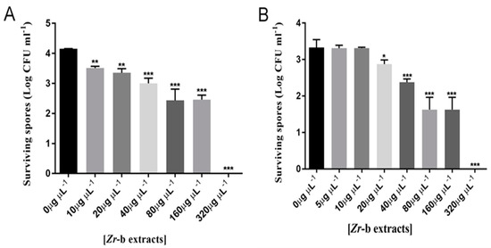 The inhibitory effect of the Zr-b extract on the sporulation of Aphanomyces astaci UEF88662 (A) and Fusarium avenaceum SMM2 strains (B). The chloroform–methanol (9:1) Zr-b extract concentrations are reported in µg/µL. The experiments were performed in triplicate and statistical significance was examined by the two-way ANOVA test with a Bonferroni correction. Values for surviving spores are reported as mean ± SDs. Asterisks indicate statistical significance (* p < 0.05; ** p < 0.001; *** p < 0.0001).