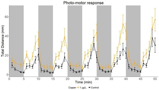 Photo-motor response of sand goby larvae exposed to copper (1 μg/L, n = 31) compared to control larvae (n = 38), tested under five cycles of light (white) and dark (shaded) conditions.