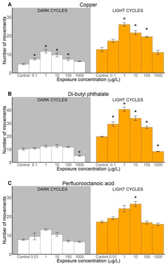 Locomotive activity (measured as number of movements) of sand goby larvae exposed to copper (A), di-butyl phthalate (B), and perfluorooctanoic acid (C). Results presented as means ± SEM (standard error of the mean) for dark (left) and light (right) cycles. Statistically significant differences (p < 0.05) between control and other treatments are indicated with asterisks (*), (n ≥ 31).