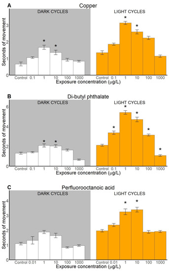 Duration of locomotive activity (measured as seconds) of sand goby larvae exposed to copper (A), di-butyl phthalate (B), and perfluorooctanoic acid (C). Results presented as means ± SEM for dark (left) and light (right) cycles. Statistically significant differences (p < 0.05) between control and other treatments are indicated with asterisks (*), (n ≥ 31).