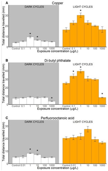 Locomotive distance (measured as distance travelled) of sand goby larvae exposed to copper (A), di-butyl phthalate (B), and perfluorooctanoic acid (C). Results presented as means ± SEM for dark (left) and light (right) cycles. Statistically significant differences (p < 0.05) between control and other treatments are indicated with asterisks (*), (n ≥ 31).