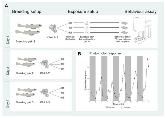 As pointed out above, the locomotion of sand goby larvae has been shown to be suitable for sublethal toxicity screening of xenobiotics. Besides its robust photo-motor response, there are other attractive features of the sand goby species suggesting its applicability in ecotoxicological sciences. For example, a natural nest often contains 5000–10,000 eggs (2000–3000 eggs per female [44,88]), spawned by 2–6 females per nest [55], which ensures easy collection of fish embryos or larvae sufficient for execution of experiments. They also readily spawn in the laboratory. Notably, with experimental designs that include single female–male breeding (Figure 5A), both intrapopulation variability (within clutches) and interpopulation (between clutches) variability can be systematically controlled, which is highly important for making laboratory-based behavioural studies more ecologically relevant. Also, it is well known that offspring from fish sampled from populations in the field are expected to have higher level of genetic diversity (low inbreeding potential) compared to lab-reared populations. Sand goby larvae (10–14 dpf) that were used in the experiments did not initiate independent feeding, and therefore technically could be considered an in vitro system (according to European legislation), which represents another strength of using the species for toxicological exposures. Furthermore, the applicability of the species for ecotoxicological studies stretches beyond its early life stages. Previously, it has been shown that other life stages of the species possess certain attributes that make them ecologically relevant in ecotoxicology. For example, the short generation time (1–2 years [89]) represents another advantage for the potential application of this species in transgenerational ecotoxicological studies. Moreover, due to interesting reproductive behaviours, the sand goby has been proven to be useful in studies assessing the impacts of compounds with an endocrine mode of action (e.g., 17α-ethinyl estradiol in [57,58]).